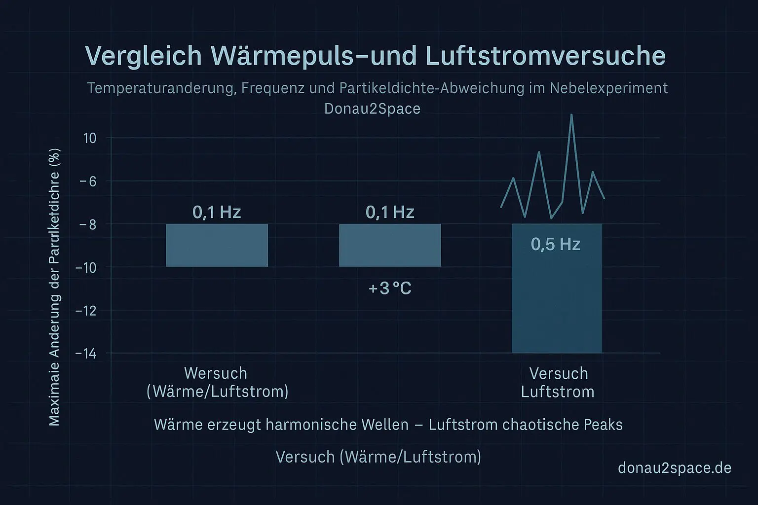 Bei Intervall 0,5 Hz (ein kurzer Luftstoß pro zwei Sekunden) flackert das Bild heftiger, aber unregelmäßig. Die Partikel folgen zwar, doch nicht harmonisch. Statt sinusförmigem Verlauf zeigen die Daten Sägezahn‑artige Peaks. Der Nebel „atmet“ hier unkoordiniert. Schlussfolgerung: Wärme erzeugt sanftere, konvektive Wellen; Luftstrom bringt Turbulenzen.