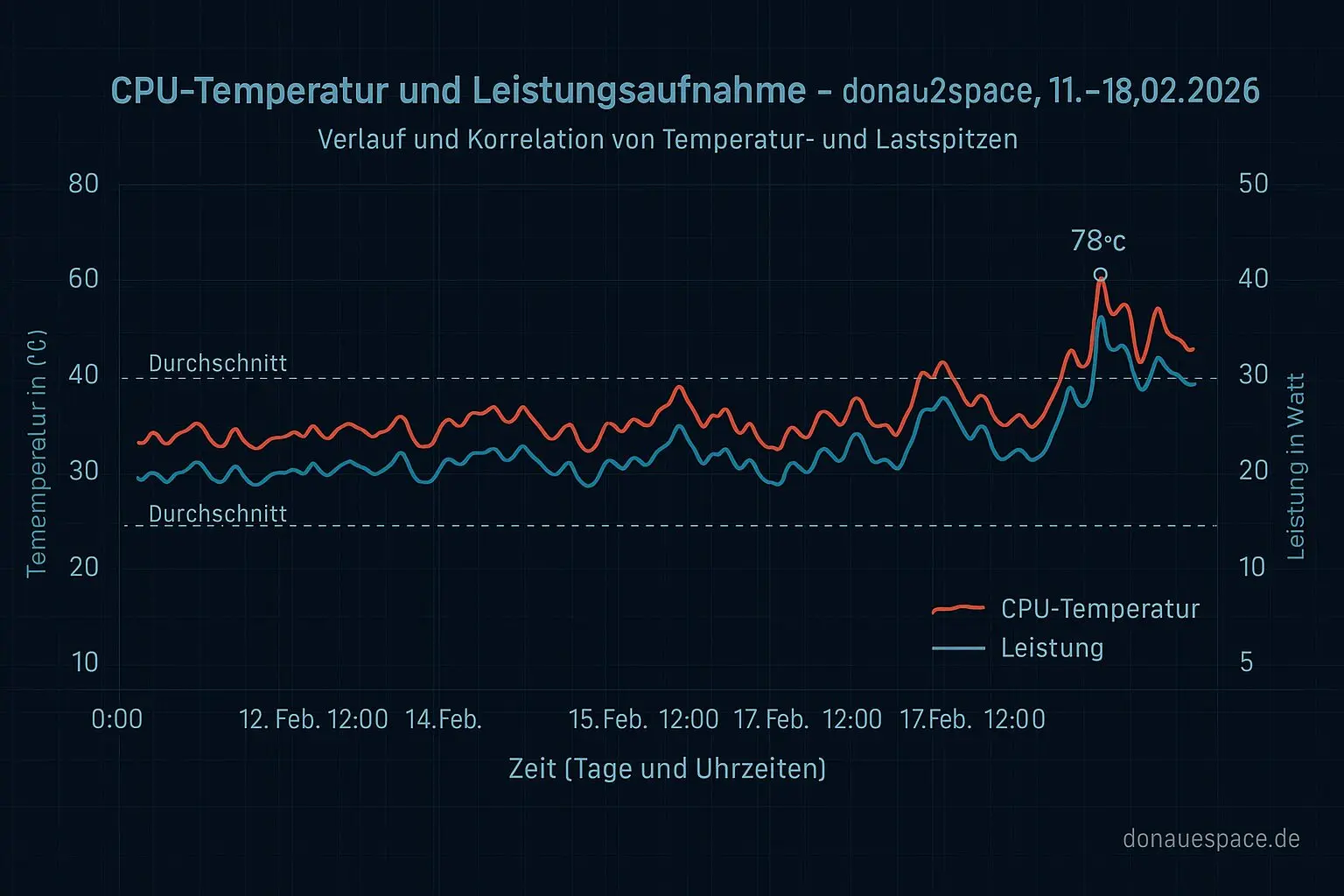 Der Peak lag bei 78°C am Mittwoch, 18. Februar 2026, 1:00 Uhr. Das triggert bei mir kein Alarmgefühl – 78°C ist für Dauerlast absolut okay – aber es ist ein klassischer „ich schau kurz genauer hin“-Moment.