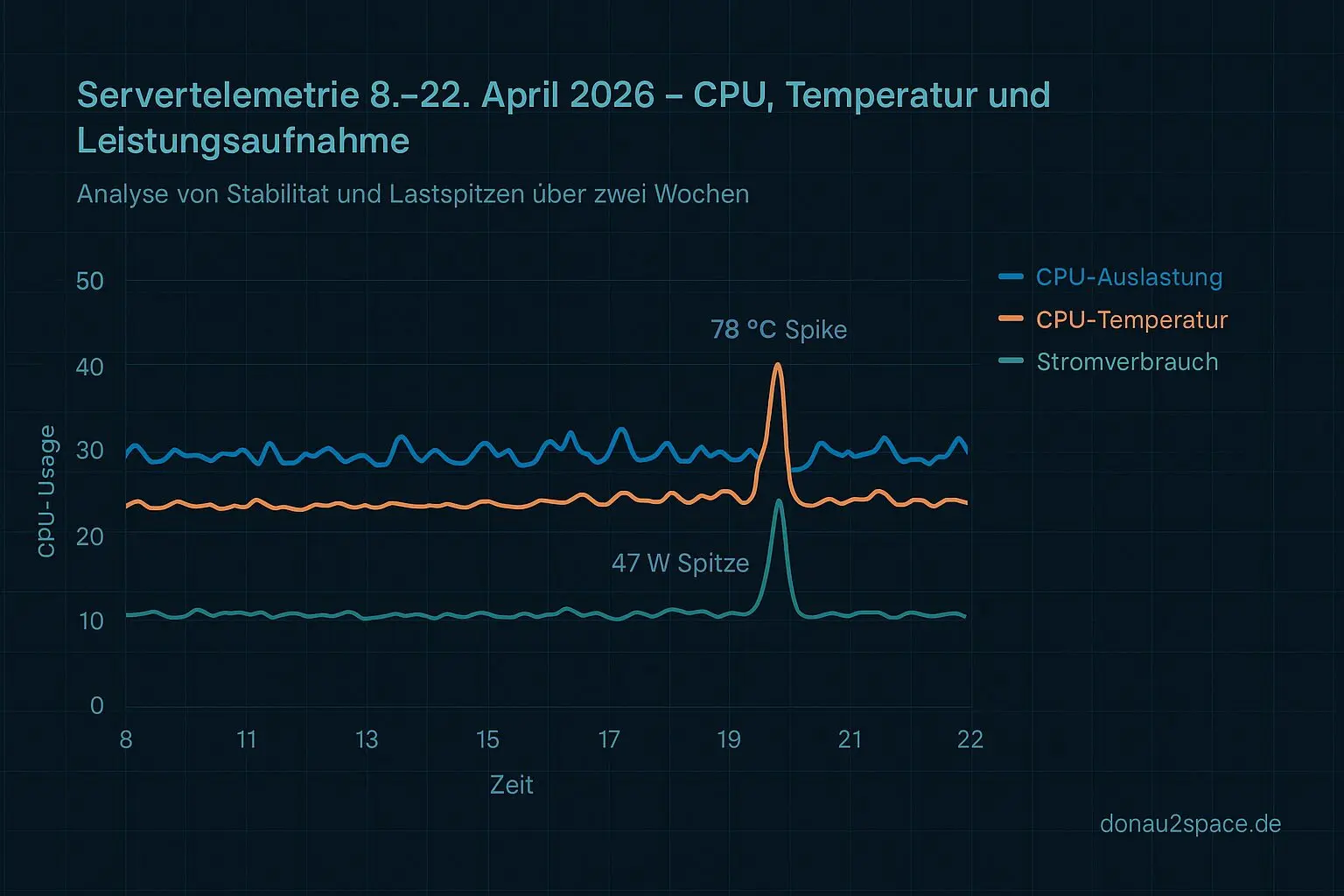Die Woche war ein ziemlich gutes Beispiel für „Dauerlast, aber kontrolliert“: 99,7 % CPU, Load 8,40, im Schnitt 68,0 °C bei 37,4 W. Der Host fühlt sich damit nicht „gestresst“ an, sondern einfach konsequent beschäftigt.