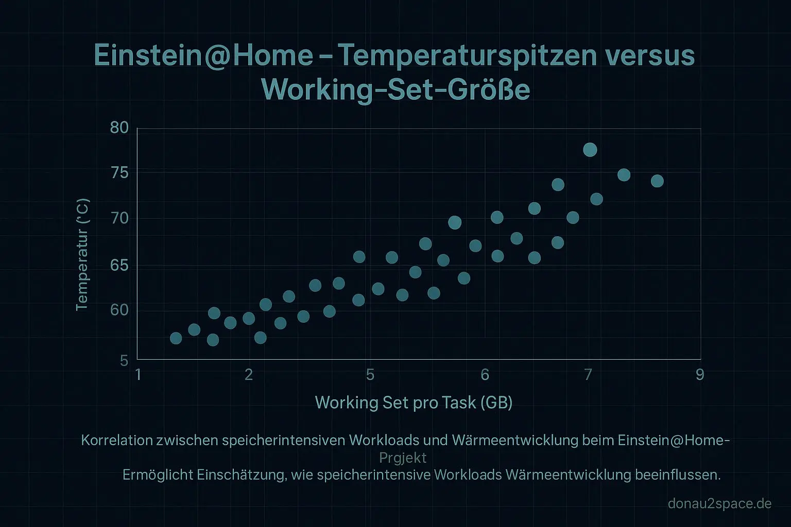 - anderer Memory‑Mix (bei Einstein mit >5 GB WS pro Task plausibel: mehr RAM‑Traffic kann nebenbei auch Wärme/Watt anheben)