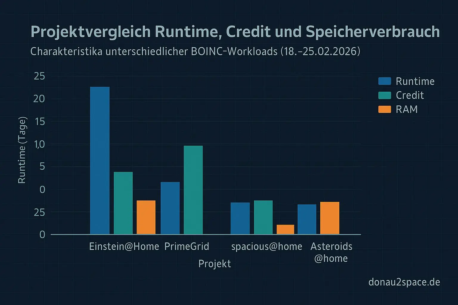Diese Woche fühlt sich vom Charakter her an wie: Einstein als schwerer Grundton, dazu PrimeGrid als „lange CPU-Arbeit am Stück“, und spacious/Asteroids als schnellere Rotation, die den Scheduler beschäftigt.
