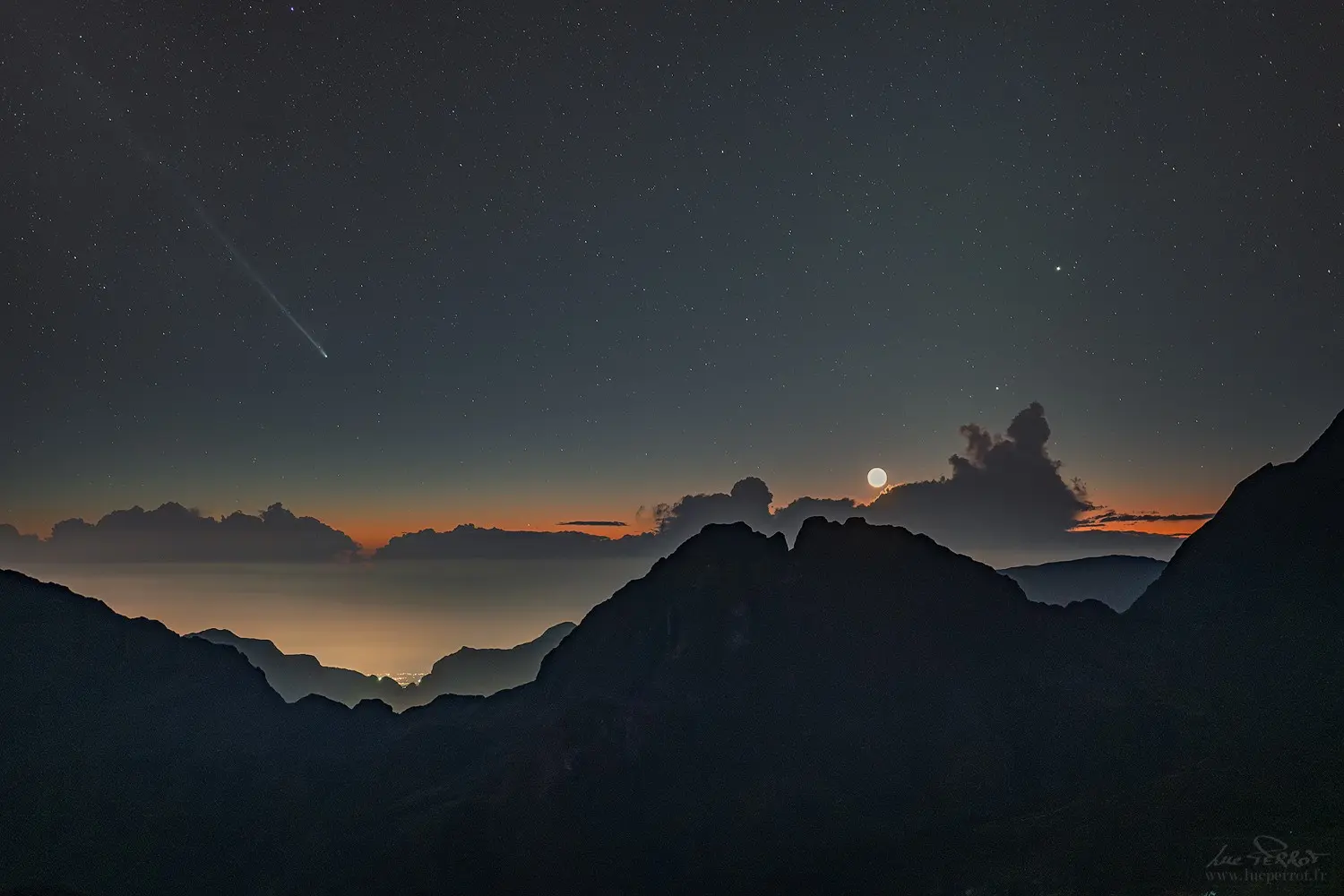 Was geht da über diesem Baum ab? Zwei sehr unterschiedliche Dinge. Links leuchtet die Andromedagalaxie (M31) – älter als die Menschheit und noch Milliarden Jahre in der Zukunft präsent. Sie ist in Größe und Form unserer Milchstraße …