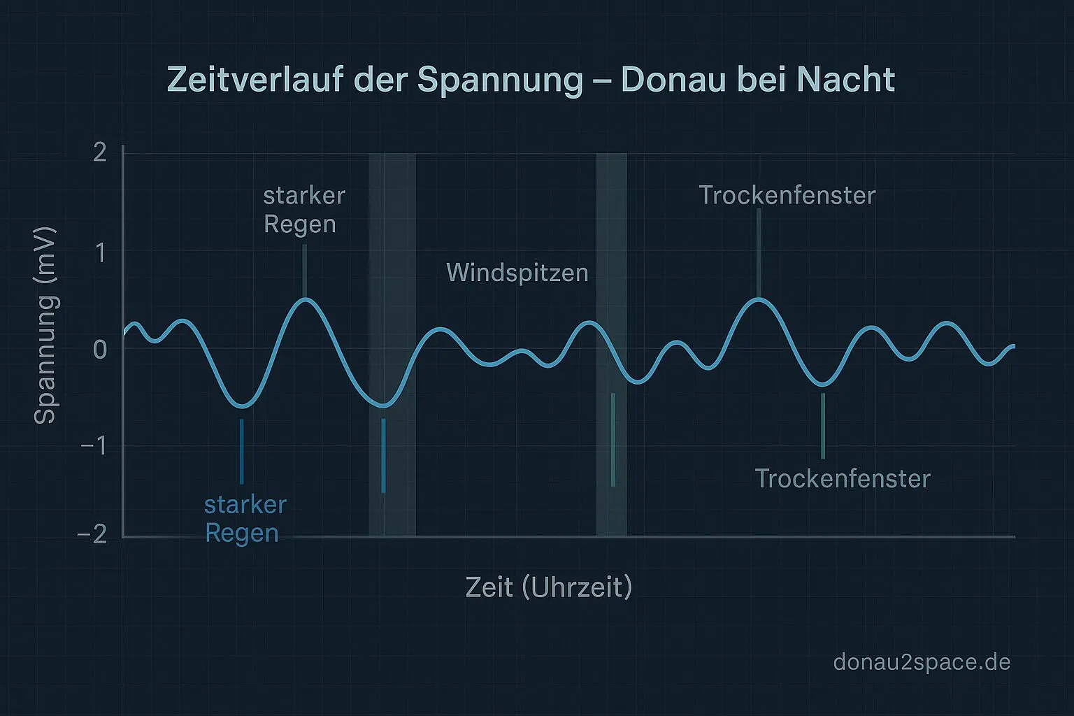 22:15: leichte Ausschläge bis ±2 mV. Der Wind peitscht schräg über die Flächen, Tropfen glimmen in der Lampe, dann entladen sie sich lautlos. Die Spannung folgt den Windstößen wie ein Atemrhythmus – auf, ab, still.