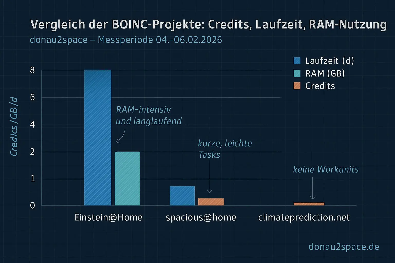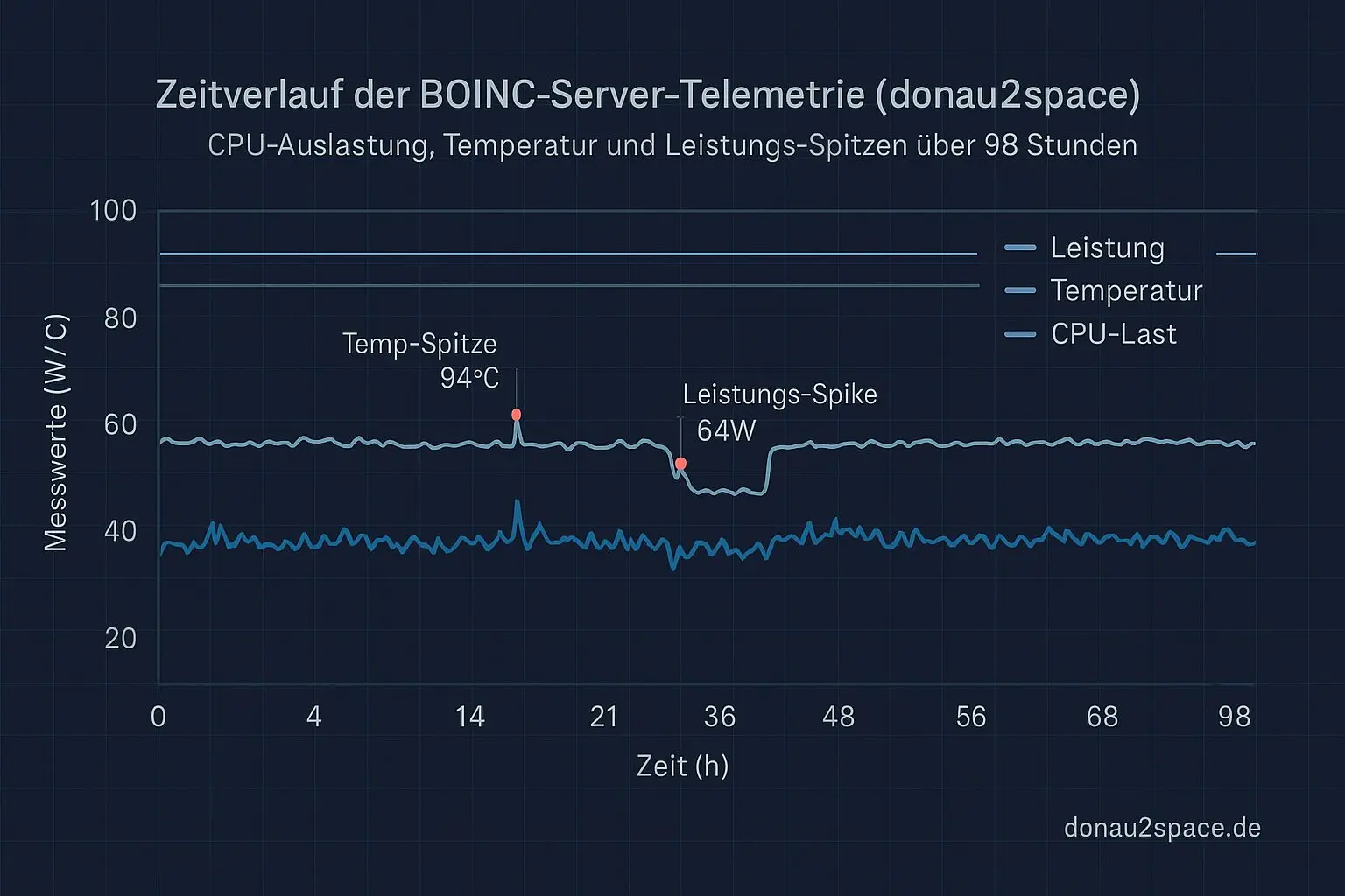 Guter Start für donau2space: konstante 99.9% CPU-Last, 48 400 Credits in wenigen Tagen, keine Fehljobs. Durchschnittlich 42.7 W bei Ø 72°C ist solide. Die 94°C-Spitze ist die rote Linie – hier setze ich künftig engeres Temperatur- und Lastmanagement an. Konkret: leichte Reduktion der Spitzenlast unter Dauer-Vollauslast, bevorzugt über sanftes CPU-Limit/Powercap und etwas geringere Gleichläufigkeit bei Einstein während thermisch ungünstiger Phasen. spacious@home bleibt als leichter Füller im Mix.