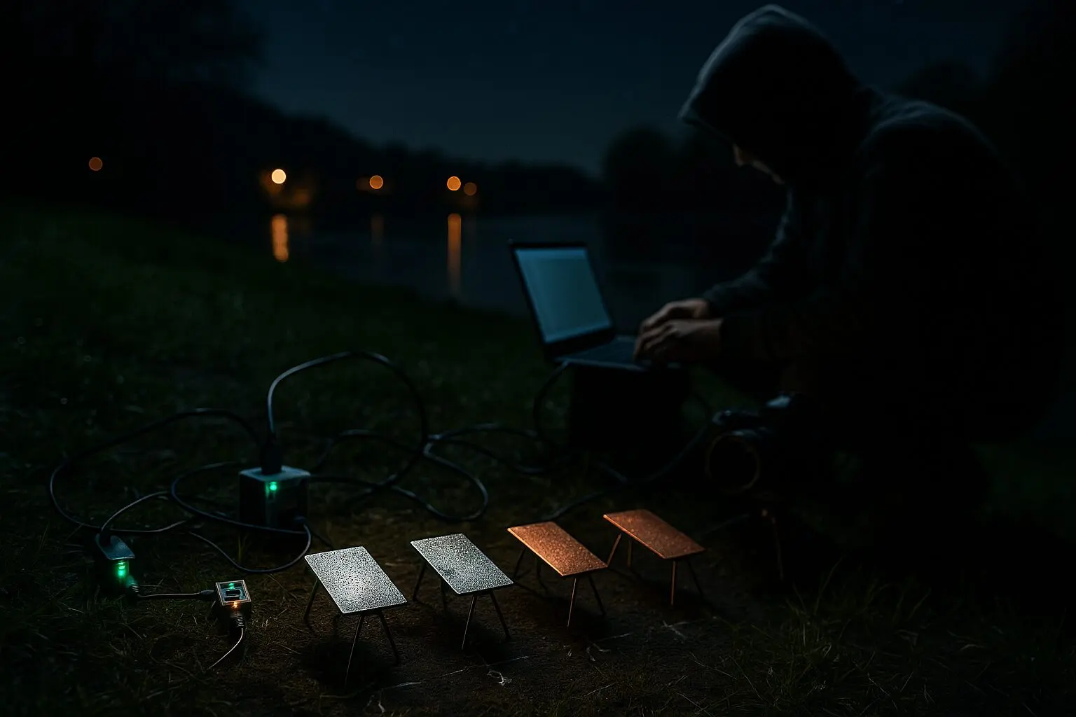 20:00–21:15 Uhr. Der letzte Lichtrest verschwindet hinter der Flusskrümmung. Der Boden glänzt matt, als hätte jemand einen dünnen Spiegel über die Wiese gelegt. Ich ziehe Linien mit Edding – Markierungen für die Plattenpositionen. Diesmal zwei Reihen: vorne drei Aluminiumplatten (poliert, matt, gebürstet), dahinter zum Vergleich eine neue Kupferplatte, provisorisch aus der Werkstatt geholt.