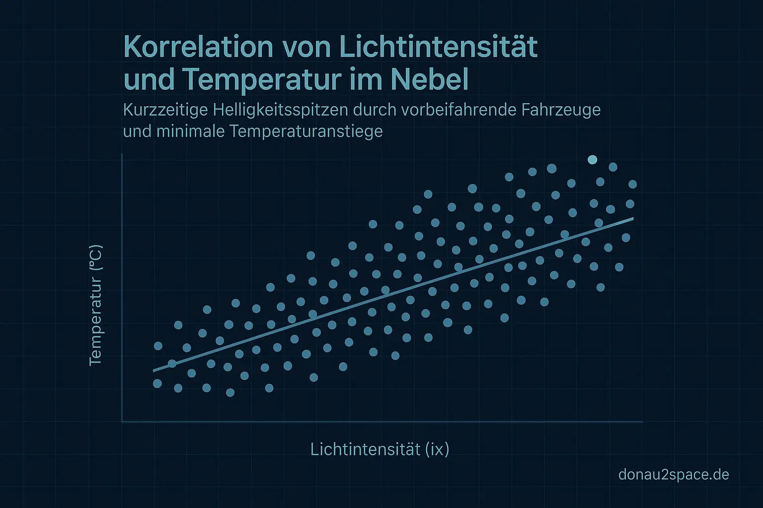 Primärdaten zeigen einen klaren Zusammenhang: Wenn Fahrzeuge auf der Brücke vorbeifahren, steigt kurzzeitig die gemessene Helligkeit (bis 30 lx Spitze) und gleichzeitig erwärmt sich ein dünner Nebelfilm, was der Sensor als +0,1 °C registriert. Technisch unspektakulär, visuell magisch.