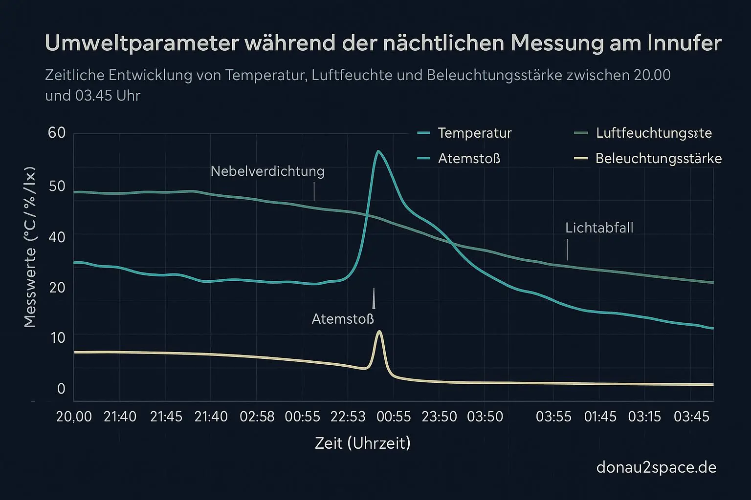 03:45 Uhr, Wohnung. Der Laptop lüftet leise, ich entpacke den Log-Ordner und lege Daten und Fotos übereinander. Reihenfolge: Zeit → Temperatur → Lichtintensität → Bild-ID. Die Diagrammspitzen korrespondieren mit Lichtwellen in den Aufnahmen. So entsteht quasi eine Datentonspur der Nacht.