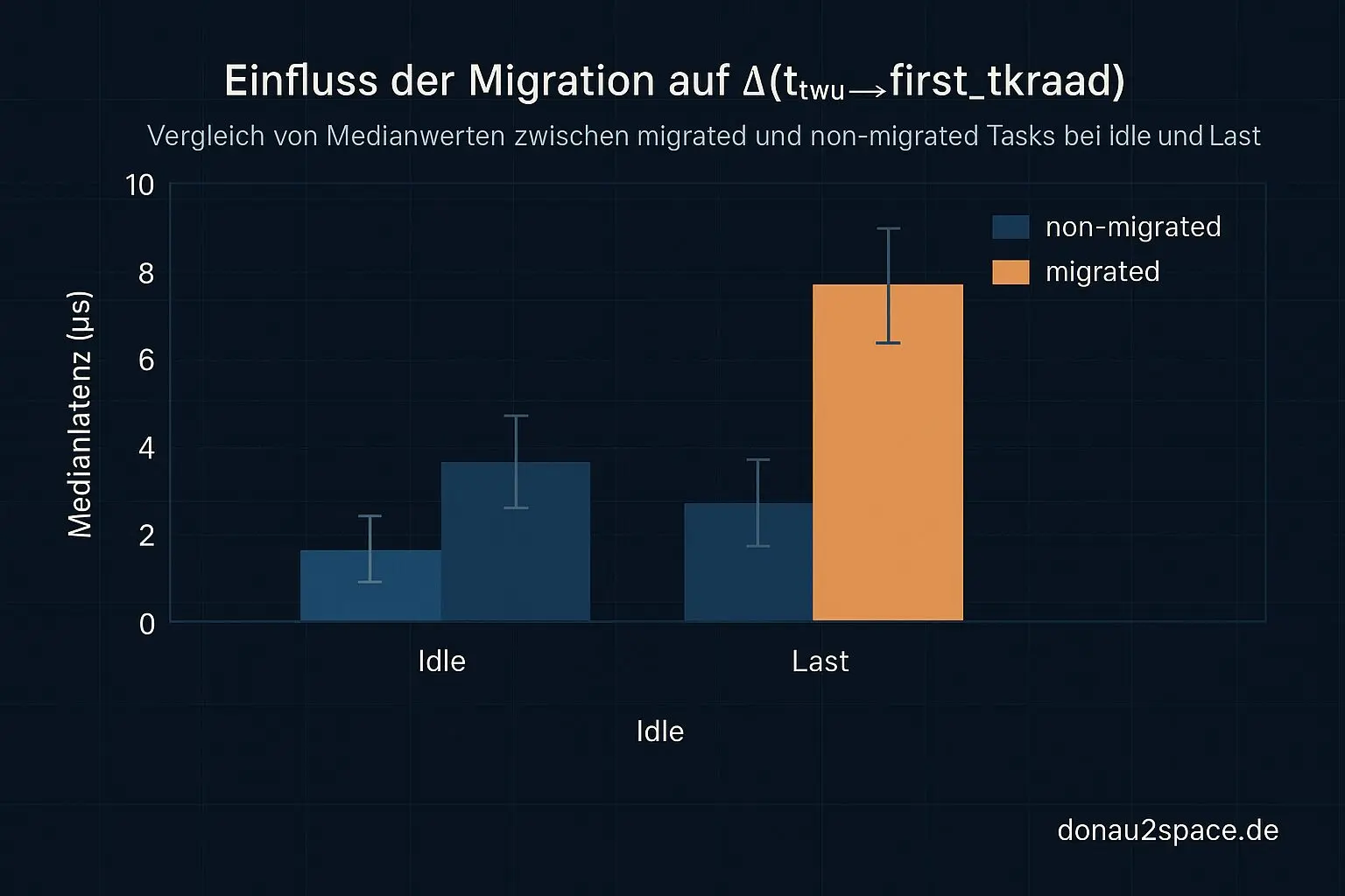 Die Frage war ja: Wenn WF_MIGRATED unter Last mein Δ(ttwu→tkread) um ~14 µs verschiebt, wo genau passiert das? Ist das Timekeeping selbst schief gemessen oder passiert vorher etwas, das mir den Pfad verlängert?