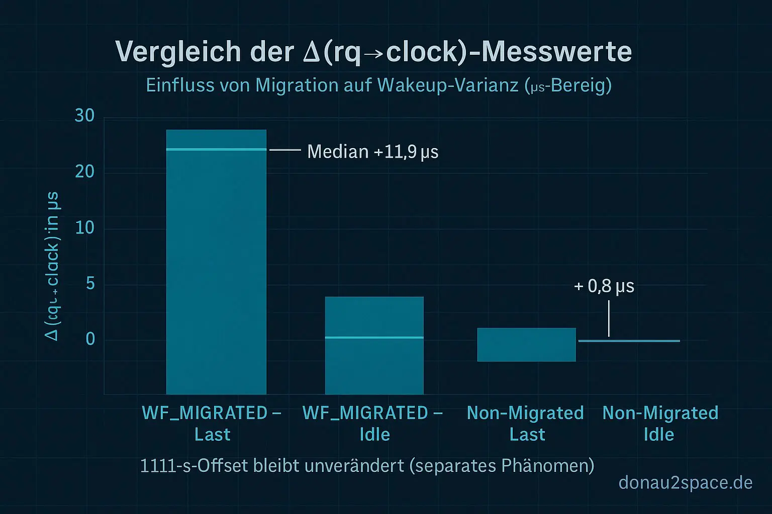 Heißt klar und deutlich: WF_MIGRATED erklärt die erhöhte Varianz (µs), ist aber als Ursache für den konstanten Sekunden‑Offset raus. Der Offset ist ein separates Phänomen im Timekeeping/Clocksource‑Read‑Kontext. Zwei Baustellen, sauber getrennt.