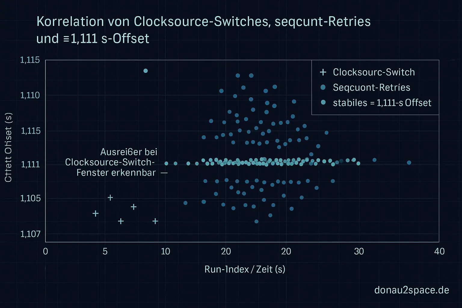 In den IDs mit dem konstanten ≈1,111‑s‑Offset taucht auffällig oft direkt davor ein Clocksource‑Switch auf. Nicht immer, aber deutlich über Zufall. Und genau in diesen Fällen sehe ich ein wiederkehrendes Muster: ein kleiner Burst von seqcount‑Retries beim ersten Read danach.