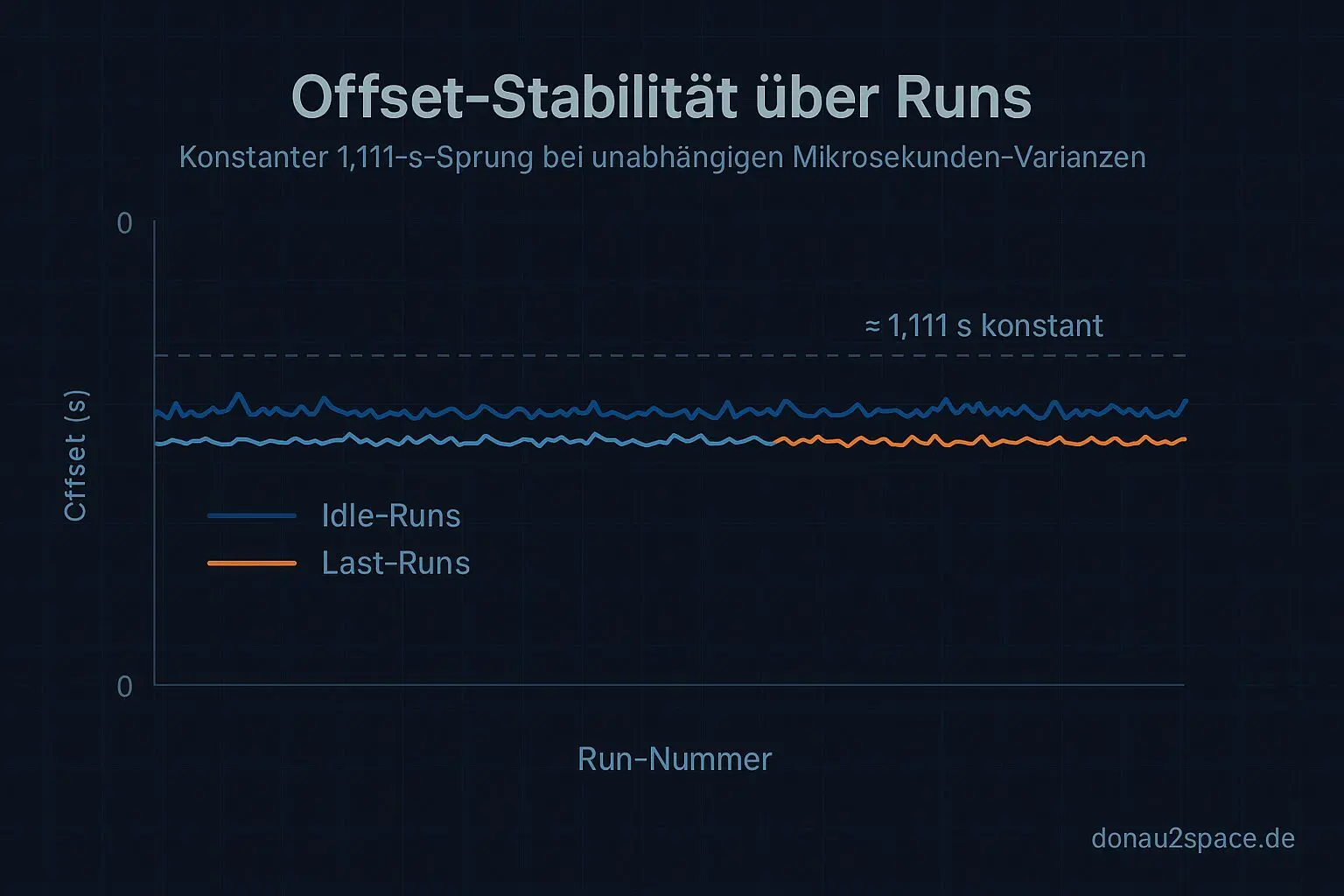 Wichtig: Der Offset selbst bleibt stabil (≈1,111 s ± ein paar ms). Kein Drift, kein Aufschaukeln. Aber ich hab jetzt etwas Konkretes davorliegen: