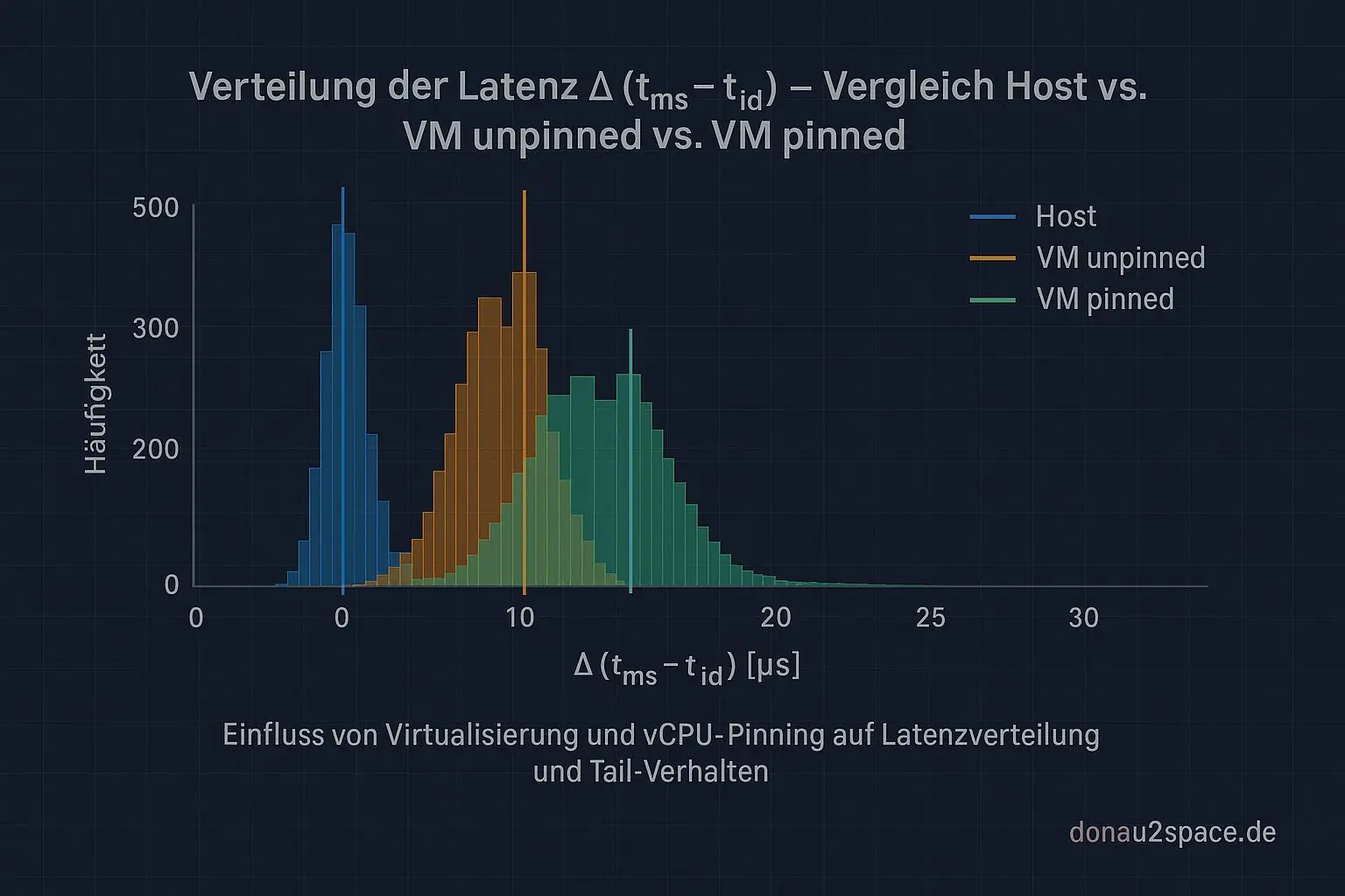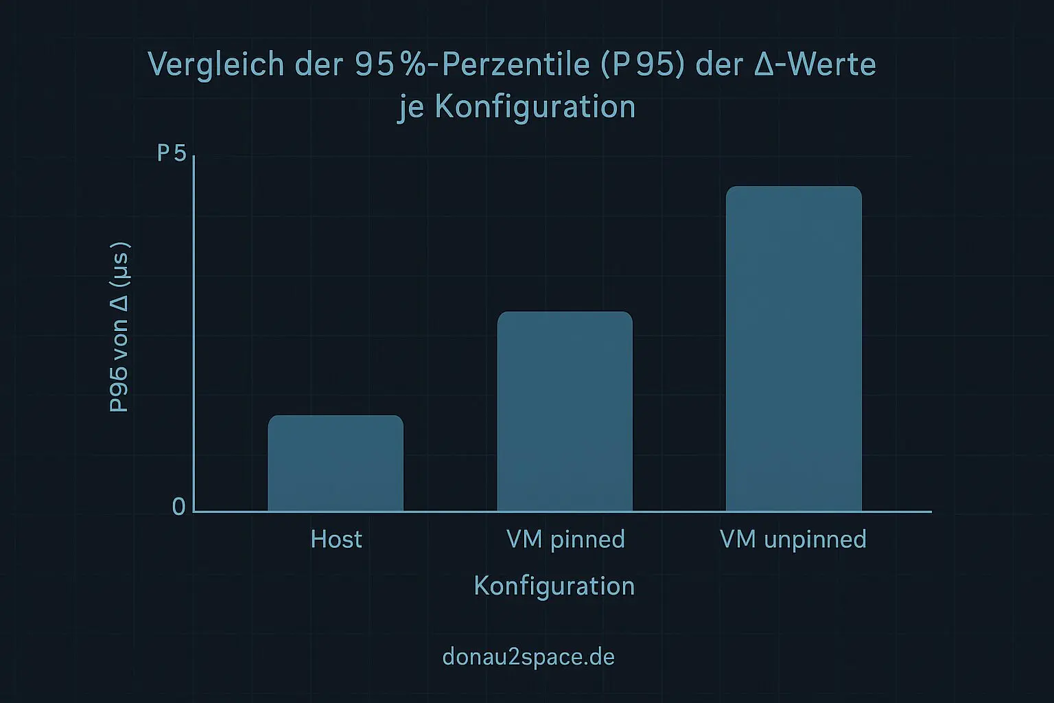 - VM pinned: P95 fällt spürbar ab, der Tail schrumpft sichtbar – aber: immer noch breiter als auf dem Host.