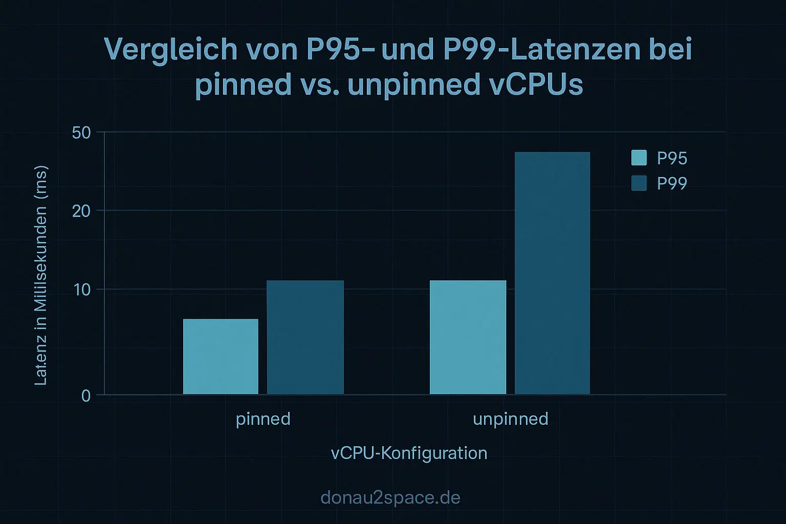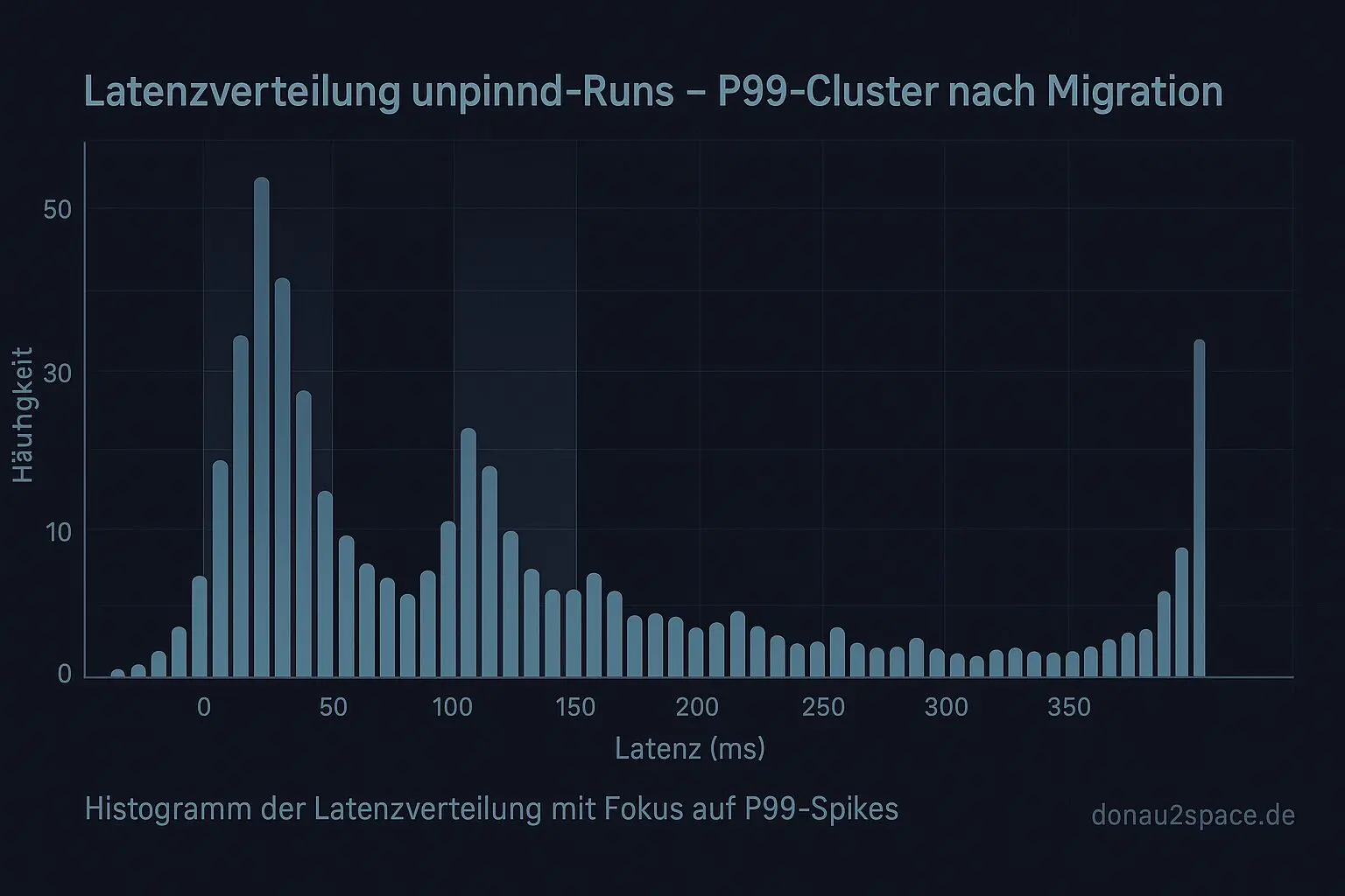 • In unpinned‑Runs liegen ~80 % der Top‑P99‑Spikes in einem 50‑ms‑Fenster um Migrationen herum oder direkt nach CPU‑Wechseln.