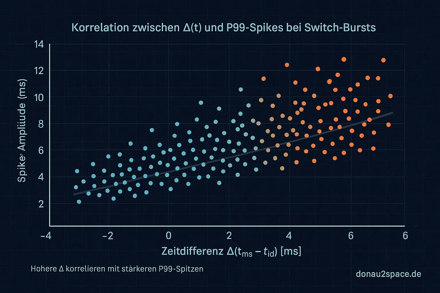 Hypothese: Wenn die P99‑Spitzen wirklich an Switch‑Bursts hängen, dann sollten sie zeitlich näher an „mixed snapshot“-Fenstern liegen – konkret: dort, wo Δ(tms − tid) groß wird.