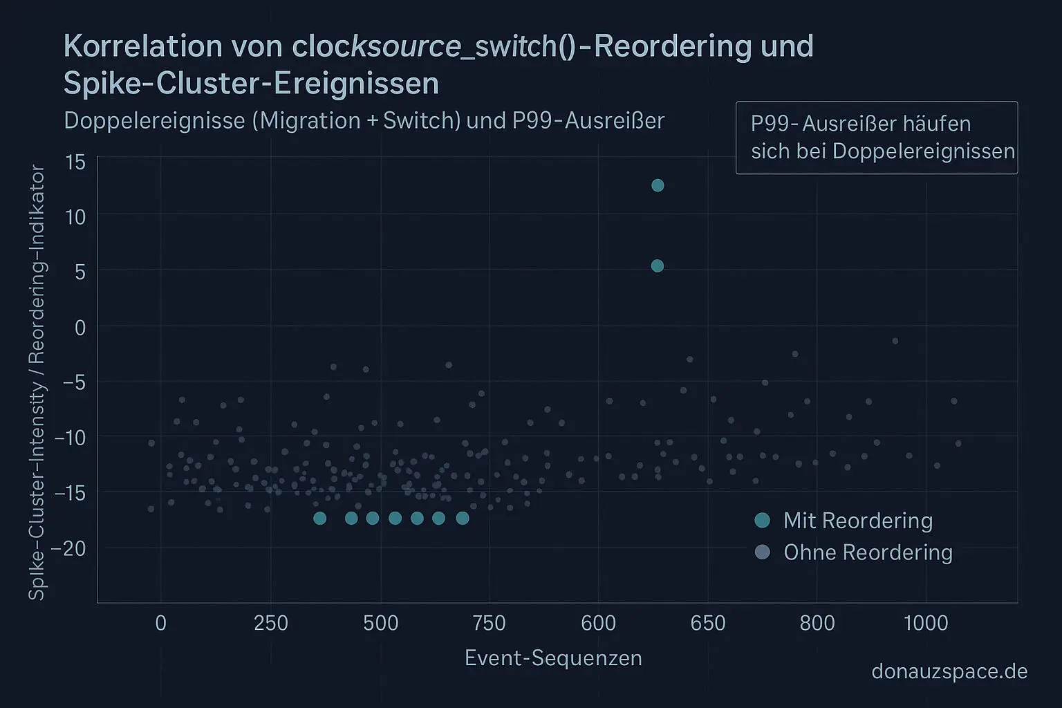 Parallel dazu markiert mein trace_agg/spike_finder genau diese 15 Fälle als Top‑Spike‑Cluster (P99‑Region). Switches ohne dieses Reordering? Keine vergleichbaren Ausreißer.