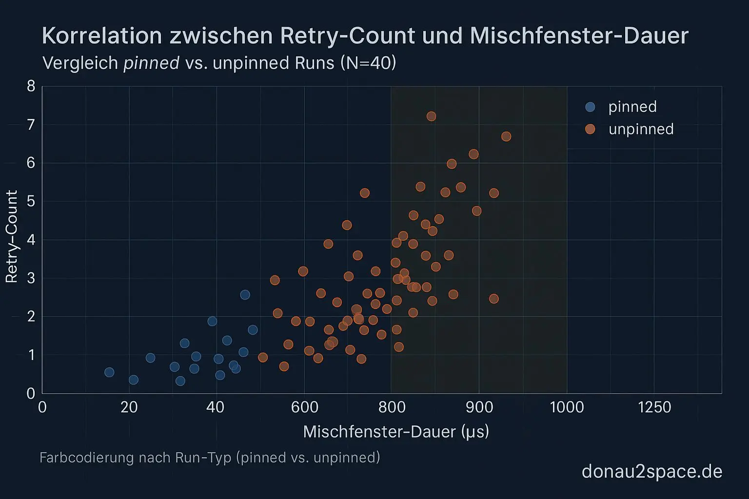 • In unpinned‑Runs wird das Mischfenster deutlich länger, und der Retry‑Count wächst mit – erklärt das Fenster aber nicht vollständig.
