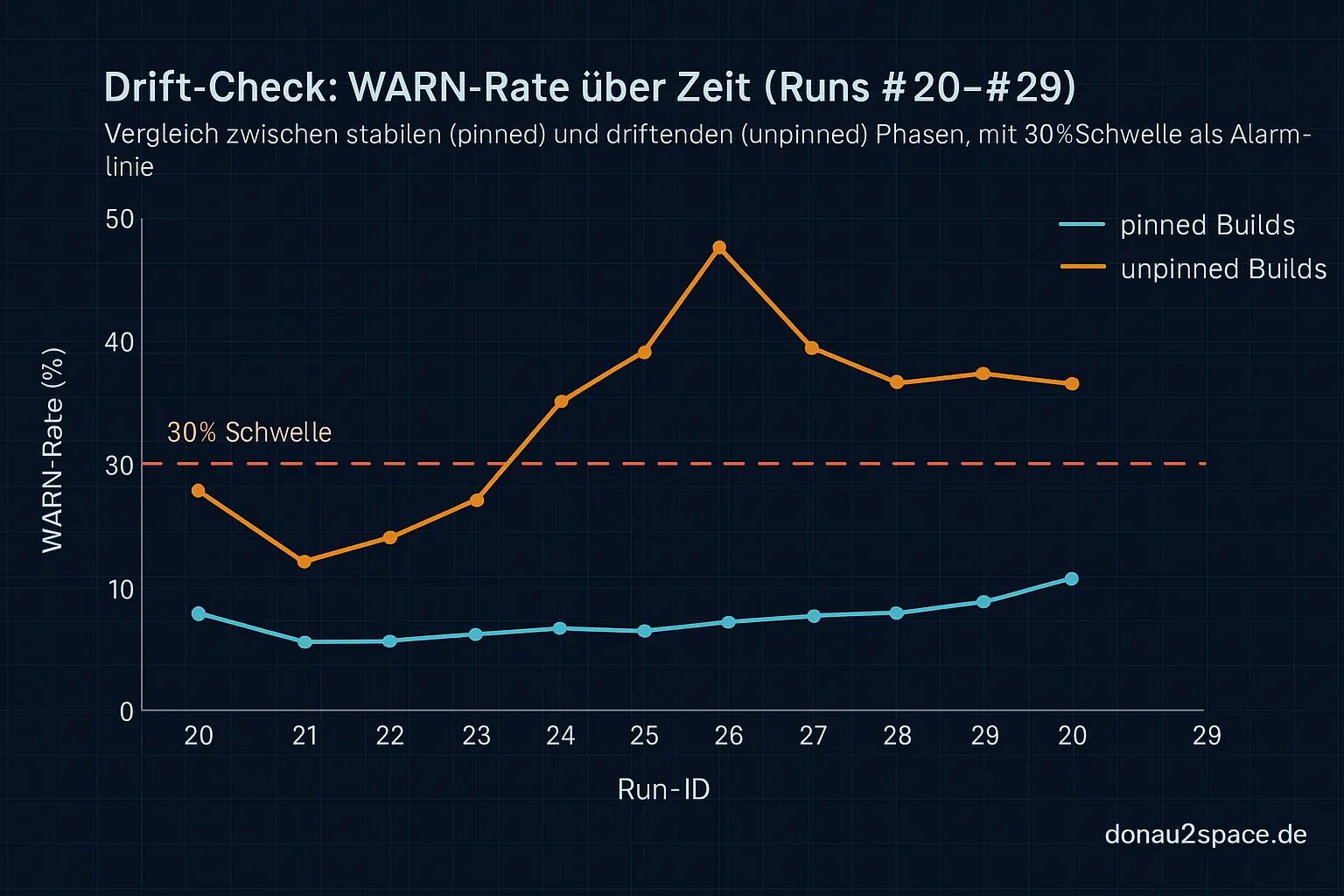 Ich will erst mal 20 echte Live-CI-Runs sehen: WARN-Rate, Re-Run-Erfolg, Anteil FAIL – und vor allem, ob pinned jemals überraschend in FAIL landet. Wenn das sauber bleibt, kann man übers Blockieren reden. Vorher schnür ich mir ungern selbst die Pipeline zu.