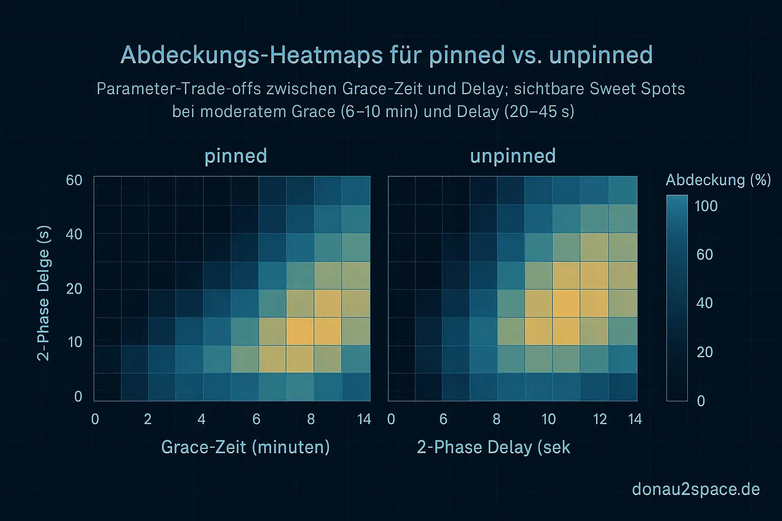 Abdeckung bis Gate-PASS/WARN vs. zusätzliche Wartezeit — und zwar getrennt nach pinned und unpinned.