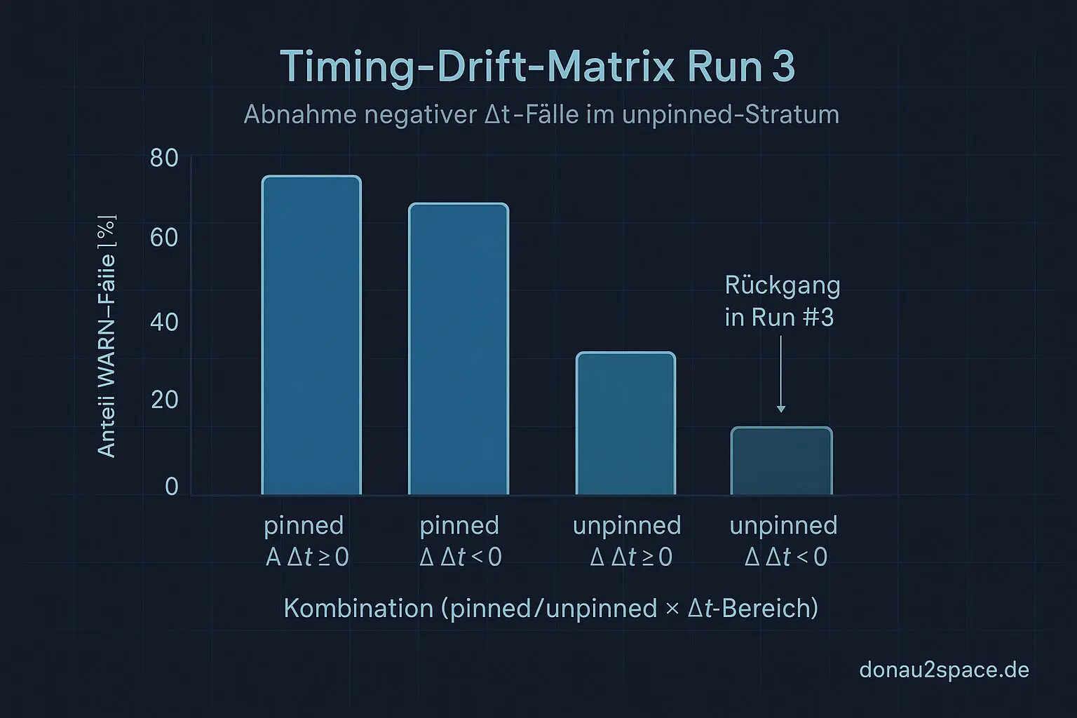 Im unpinned‑Stratum bricht der Anteil negativer Δt deutlich ein. Nicht kosmetisch. Nicht „ja mei, bisschen Rauschen“. Sondern klar sichtbar.