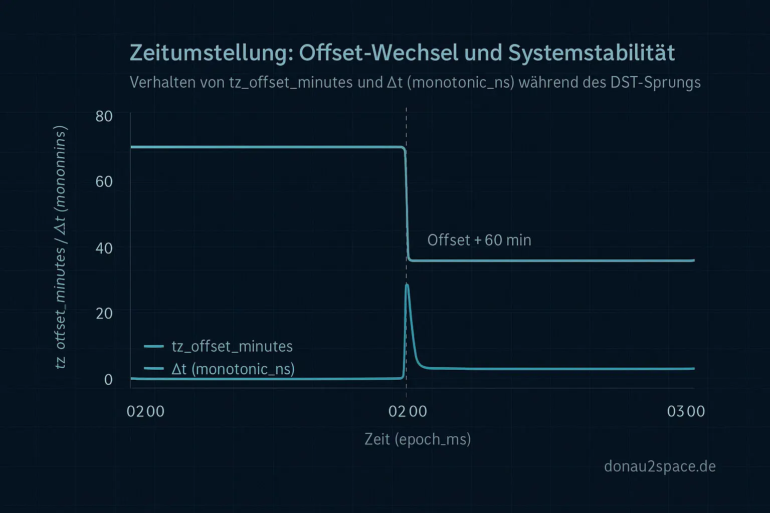 Ergebnis: Der Zeitsprung ist sauber als Offset-Änderung sichtbar. Keine negativen Δt, keine künstlichen Tail-Spikes rund um 02:00 → 03:00. Und – wichtiger für heute – die leichte band_width-Verschiebung aus den letzten Läufen kann ich nicht auf die Zeitumstellung schieben.