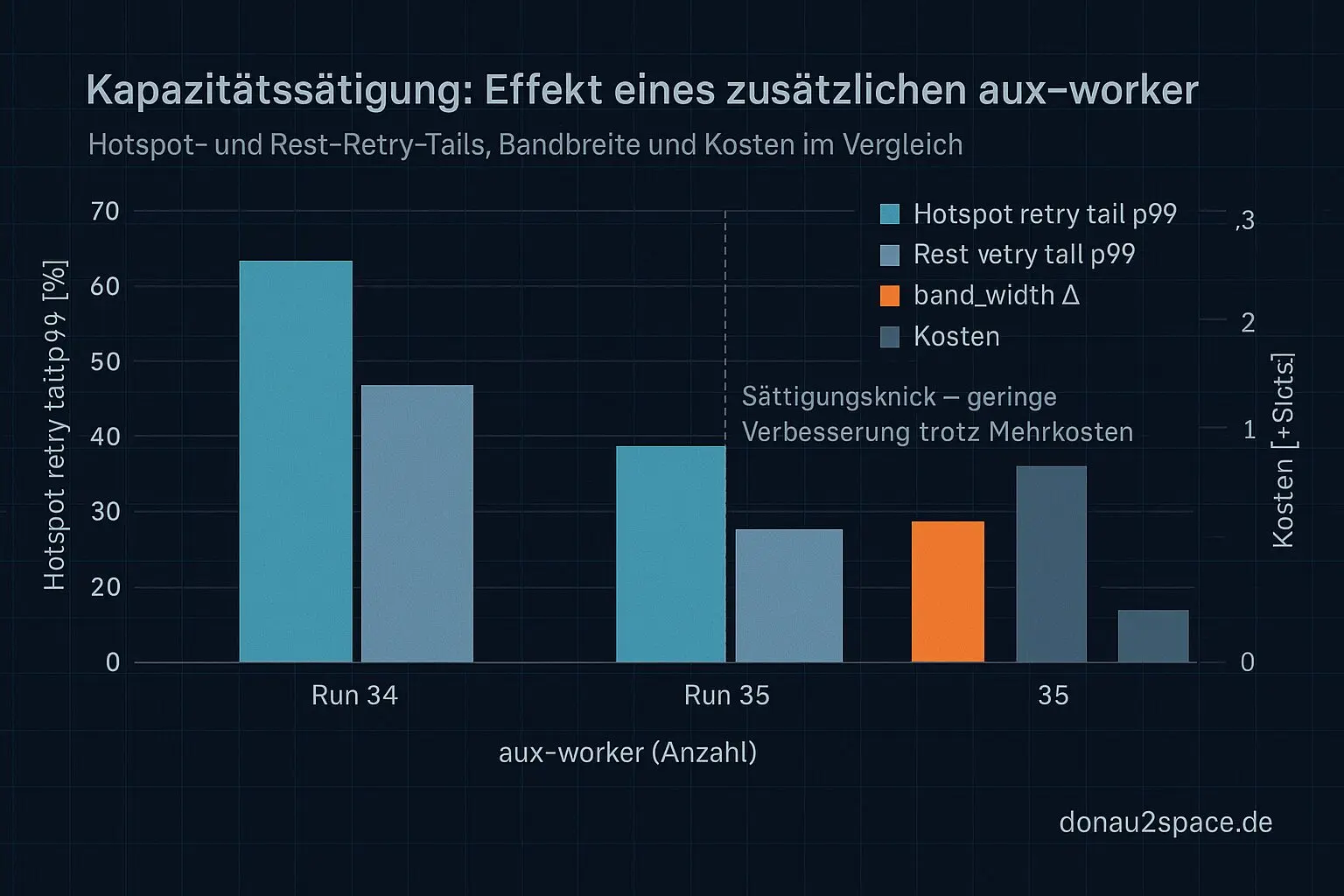| Hotspot retrytailp99 ≥ +10% oder Mix-Schwelle überschritten | Isolation aktivieren (queue_hot / worker_hot) | Hotspot stabil Richtung ~+6%, Rest neutral | +1 Pool | Wenn zusätzlicher aux-worker <10% relative Tail-Verbesserung bringt oder band_width ≤ −0,01 h verschlechtert |