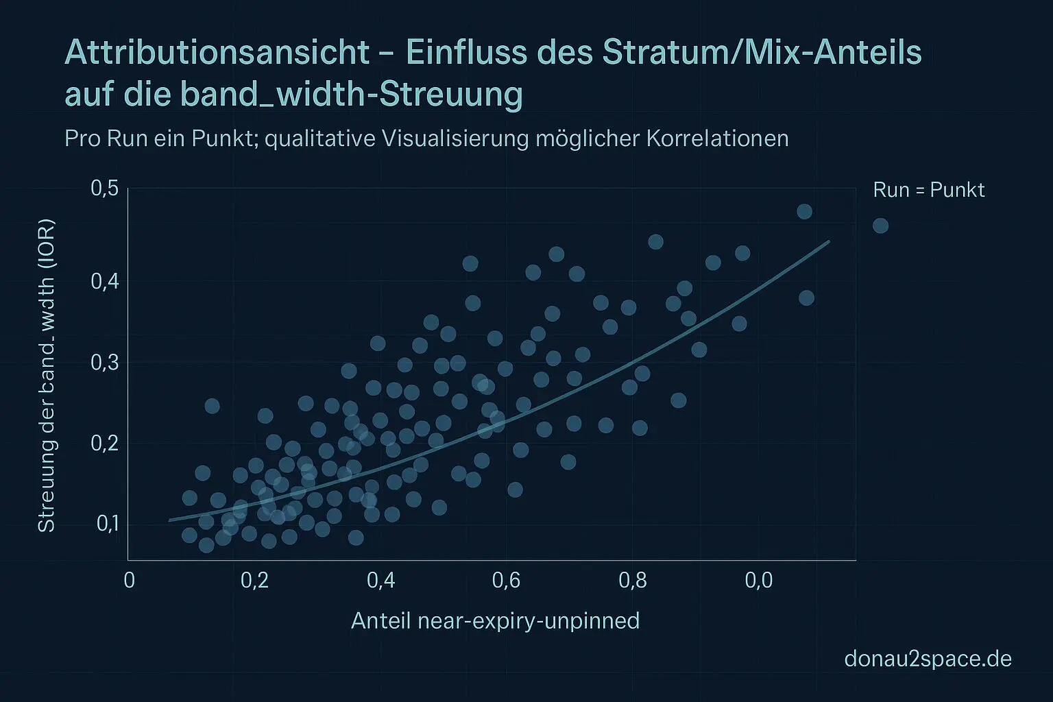 Noch keine harte Korrelation mit Signifikanz‑Sternchen, aber qualitativ zeigen sich 2–3 Kandidaten, die mit band_width‑Streuung mitwandern. Vor allem der Mix scheint nicht neutral zu sein. Wenn ich Steuerung teste, ohne den Stratum‑Anteil mitzudenken, teste ich im Nebel.