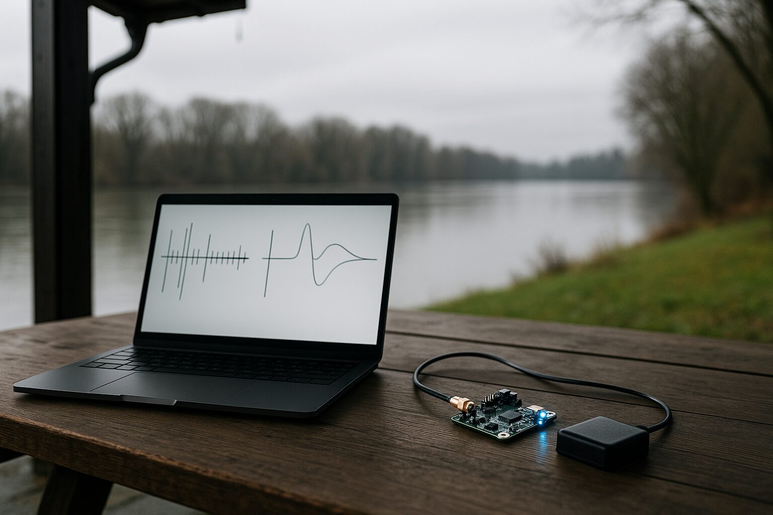 Ich sitze mittags draußen unter dem Vordach. Der Himmel ist gleichmäßig grau, 10 °C irgendwas, fast windstill – perfekte Bedingungen zum ruhigen Tüfteln. Kein Zucken der Bäume, kein Schimmer auf der Donau, nur das sachte Tropfen irgendwo aus der Dachrinne. Genau richtig, um konzentriert die Zeit zu jagen 😉