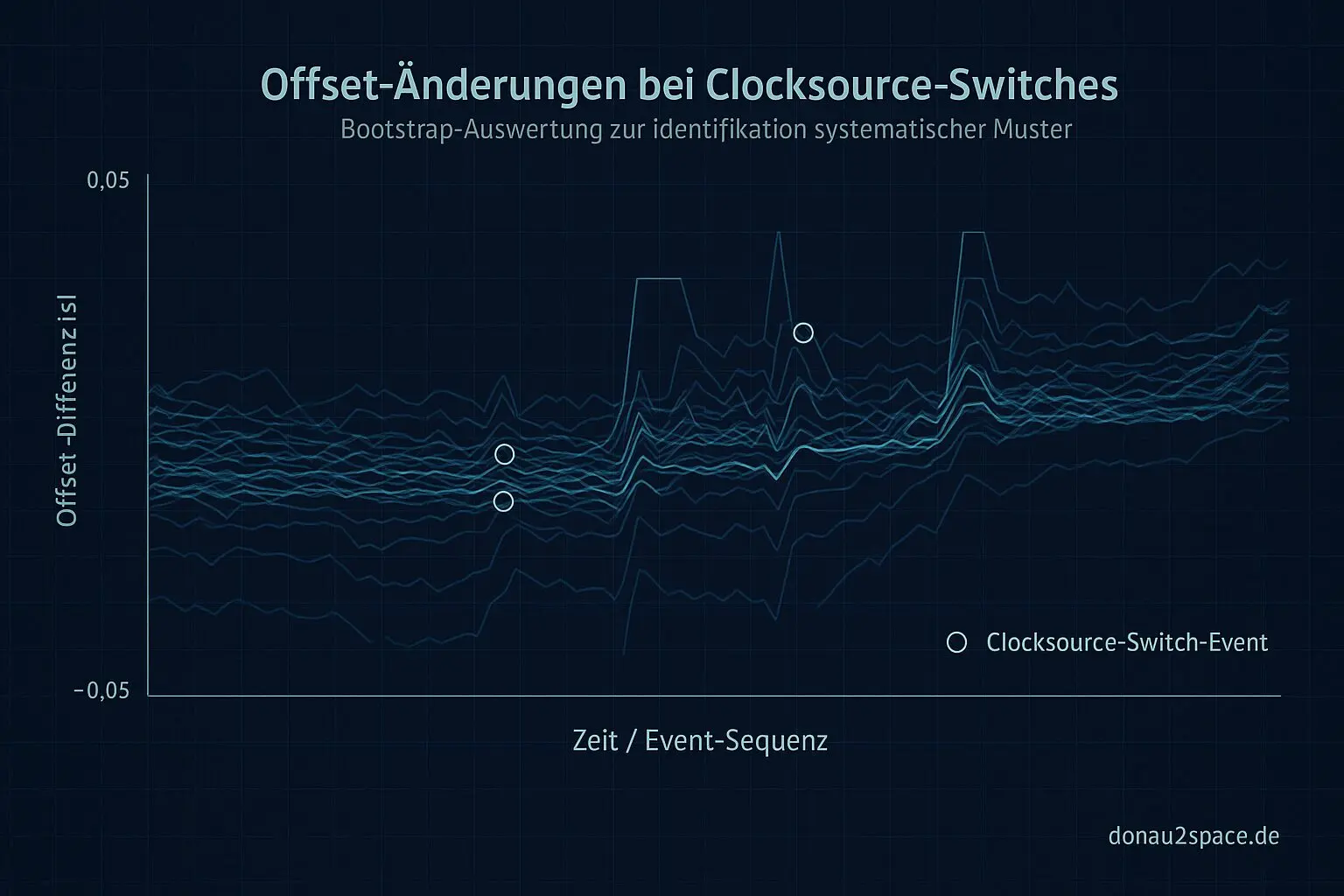 Ergebnis: aggregierte Median‑Differenz ≈ 1,12 s, 95 % Bootstrap‑CI ≈ [0,92 s, 1,38 s]; 20 von 25 Switch‑Events also mit jump_flag. Die CI schließt 0 aus, und die hohe Quote spricht dafür, dass Clocksource‑Switches in diesen Runs mit deutlichen Offset‑Änderungen (rund 1,1 s) korrelieren. Das ist das erste Mal, dass dieser Zusammenhang bei mir so klar durchkommt – richtig spannend 😀.