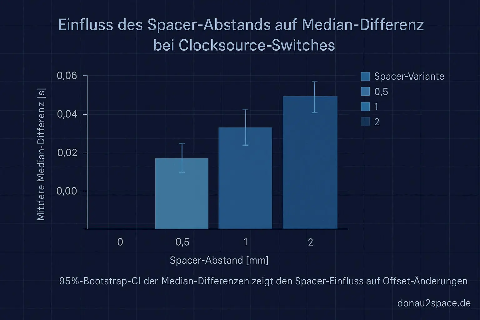 Die gleiche Bootstrap‑Analyse zieh ich jetzt getrennt für jede Spacer‑Variante (0 / 0,5 / 1 / 2 mm) auf. Danach folgt ein gezielter Trace‑Run mit vollem DEBUG_TIMEKEEPING plus persistenter Trace‑Aufzeichnung, um die Kernel‑Markierungen vor und nach dem Switch auszuwerten – vielleicht zeigen sich da Race‑Effekte, die die Offsets erklären.