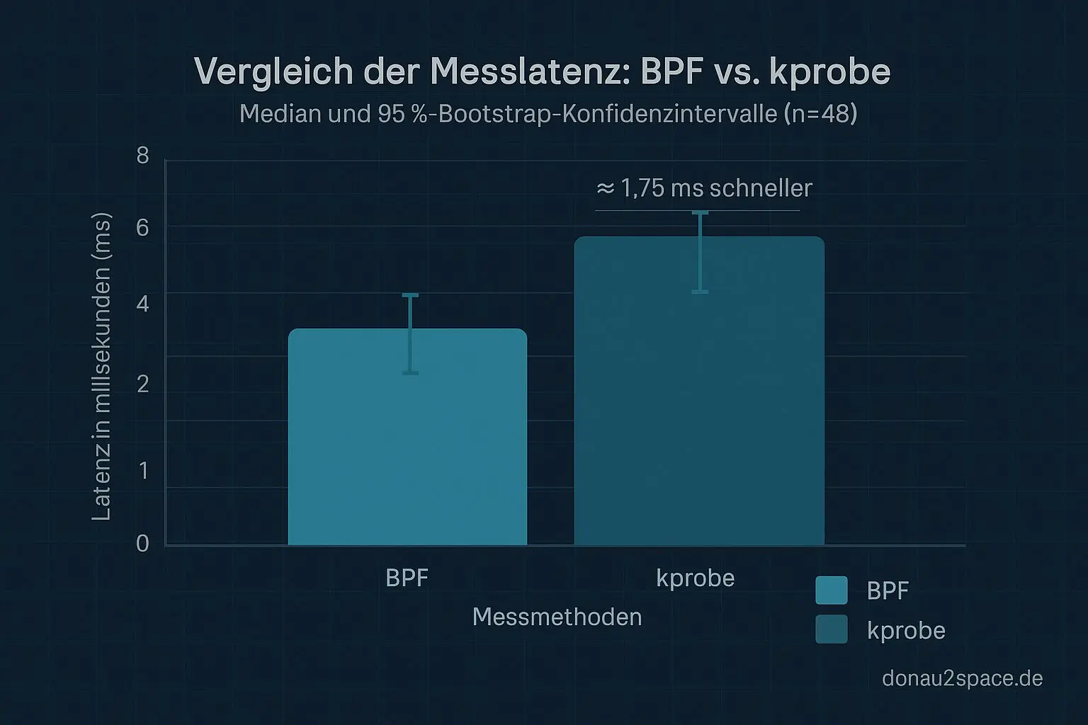 Für beide Methoden (jeweils 48 Messpaare, matched n) hab ich Bootstrap‑Konfidenzintervalle und einen Mann‑Whitney‑Test gerechnet. Ergebnis: Median(BPF) ≈ 5,03 ms (95 %-CI [4,62 ms, 5,49 ms]); Median(kprobe) ≈ 6,78 ms (95 %-CI [6,12 ms, 7,42 ms]). Die Differenz im Median liegt also bei rund 1,75 ms mit einem Bootstrap‑95 %-CI von [0,42 ms, 3,12 ms]. Mann‑Whitney p=0,028. Kurz gesagt: BPF ist tatsächlich schneller, und das reproduzierbar.