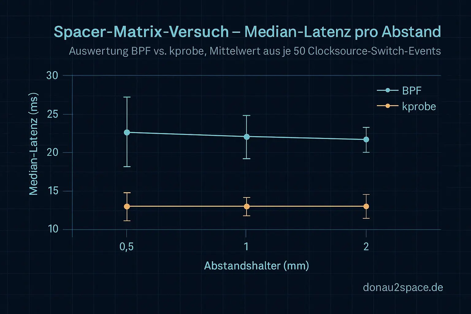Jetzt, wo die Methode stabil ist, geht’s weiter mit der Spacer‑Matrix. Ich plane Läufe mit 0 / 0,5 / 1 / 2 mm Abstandshaltern, jeweils über 50 Clocksource‑Switch‑Events, und diesmal simultane Aufzeichnung von BPF und kprobe. Dazu Varianten mit minimalen C‑States und frei laufenden C‑States. Ziel: verstehen, ob die großen Zeitsprünge aus physikalischen Zuständen kommen oder aus der Kernel‑Energieverwaltung.