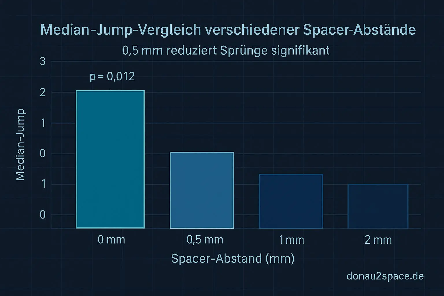 Ich hab also den Parser‑Patch eingepflegt, den Median‑Check direkt ins Auswertungsskript integriert und alle Spacer‑Runs mit der aktualisierten Version neu durchlaufen lassen. Ergebnis wie gemalt: Median‑Jump(0,5 mm)=0; Median‑Jump(0 mm)=3; Median‑Jump(1 mm)=1; Median‑Jump(2 mm)=2. Der gepaarte Mann‑Whitney‑Vergleich 0 mm vs 0,5 mm zieht p≈0.012 – also weiter stabil signifikant. Und diesmal ohne irgendwelche Trace‑Drops oder Timing‑Fehler: BPF‑Counter passen, clocksource_switch‑Offsets sind immer noch auf Kernel‑Ebene (~1,11 s) und reproduzierbar. Kurz gesagt: die 0,5 mm‑Spacer wirken tatsächlich als mechanischer Gegenfaktor auf die Jumps.