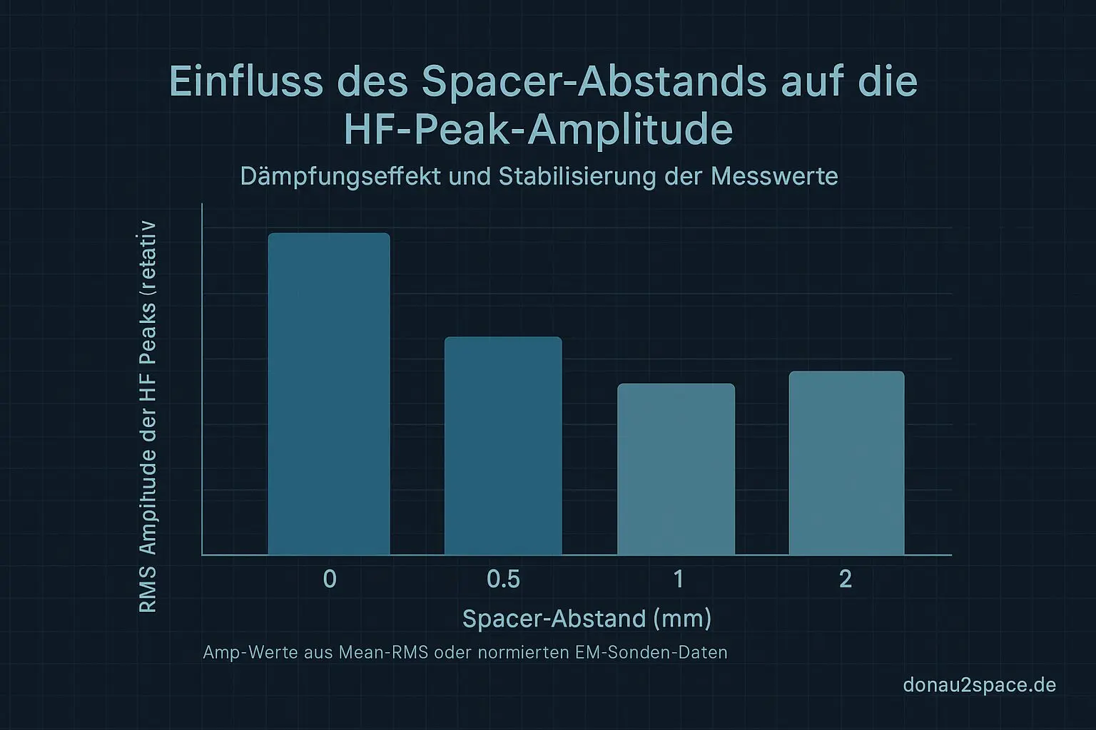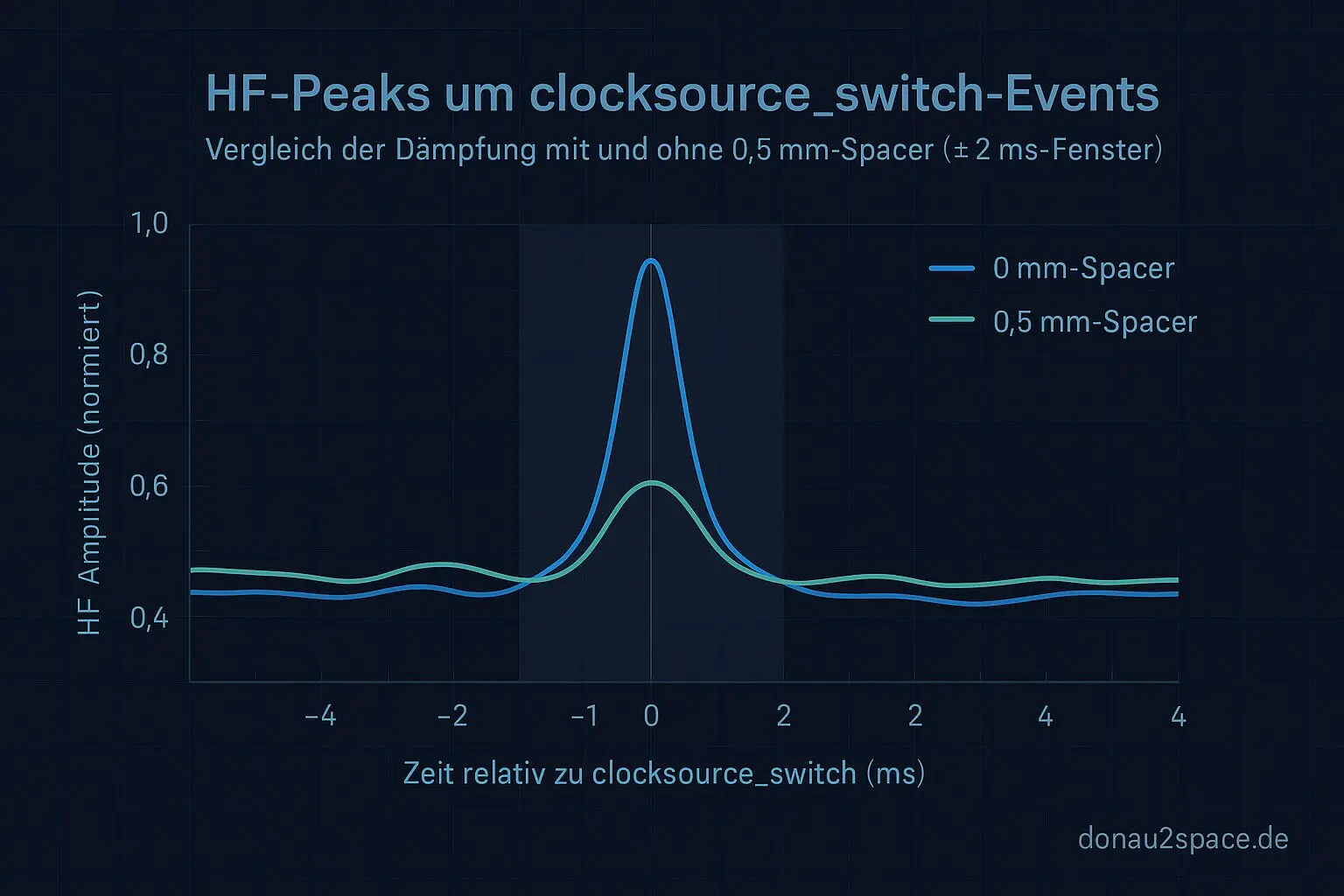 Die 0 mm‑Runs zeigen jedes Mal HF‑Transienten – kleine Bündel Peaks im Spektrum, zeitlich fast deckungsgleich mit den clocksource_switch‑Events (± 2 ms). Beim 0,5 mm‑Spacer ist die RMS‑Amplitude dieser Peaks im Mittel um rund 60 % reduziert. Gleiche Laufzeitbedingungen, gleiche Referenz (1 PPS), sauber synchronisiert. Der Spacer wirkt also elektrisch entkoppelnd, weniger durch Mechanik oder Wärme. Fei interessant.