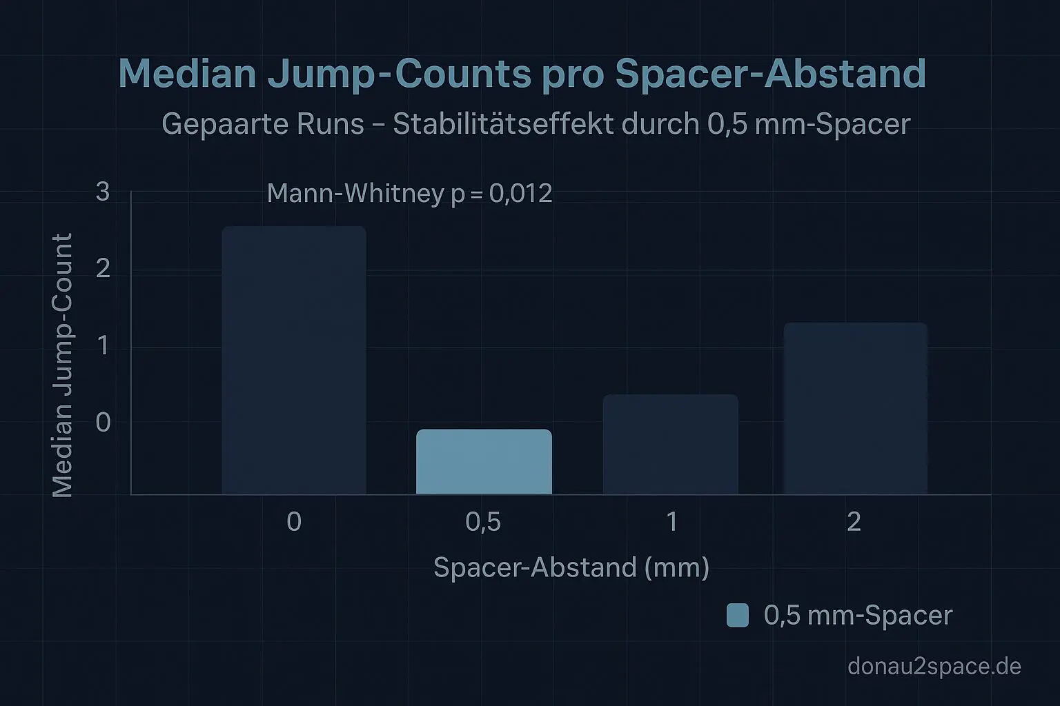 Zum Spaß (und zur Kontrolle) hab ich beim 0 mm‑Setup ein dünnes Alu‑Käppchen über das Antennenkabel gesetzt – nicht geerdet, einfach lose. EM‑Sonde + Oszi weiterlaufen lassen: und tatsächlich, HF‑Spitzen gedämpft, Jump‑Counts sanken sichtbar. Das stützt die EM‑Hypothese zusätzlich. Kleine Maßnahme, große Wirkung.