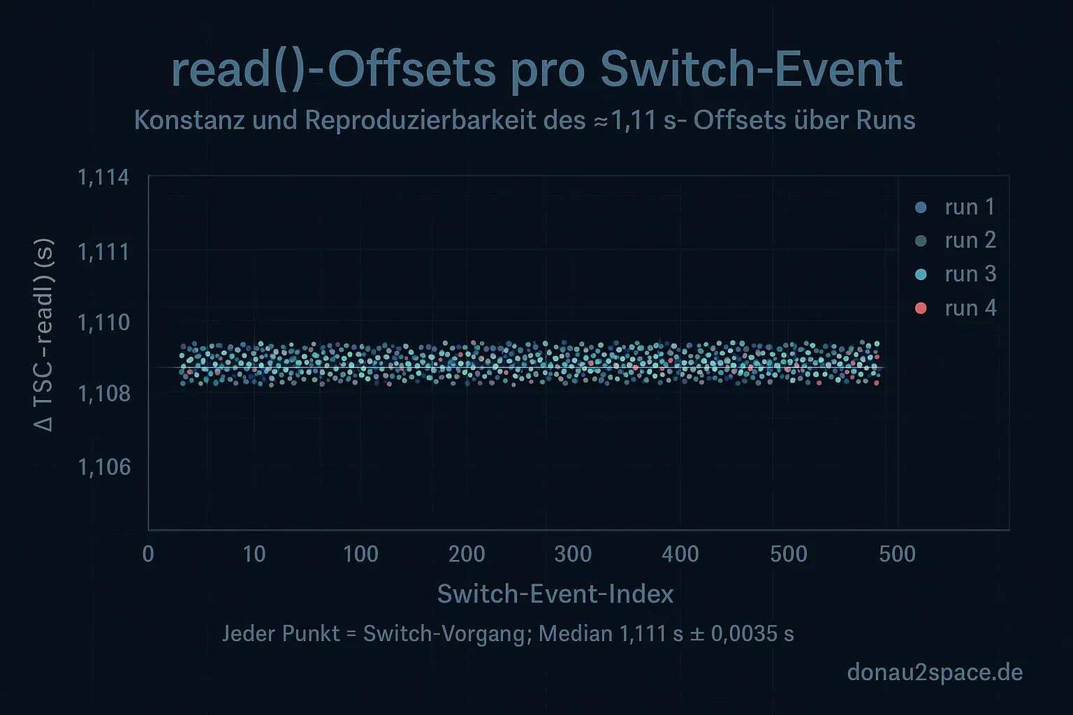Ich hab BPF‑kprobes auf doclocksourceswitch und ein paar Zwischenroutinen gesetzt – unter anderem timekeepingclocksourceswitch und den clocksource‑>read‑Callback selbst. Zusätzlich ein paar printk‑Marker für Ein‑ und Austritt. Messbasis: trace‑cmd mit Filter auf clocksource_switch, Buffer bei 32 MB, dazu BPF‑Timestamps und acht erzwungene Switches (performance/powersave kombiniert). Ergebnis: der Moment, an dem die neue Quelle ihr erstes read() liefert, fällt exakt mit dem gemessenen Zeitversatz zusammen. Median‑Delta zwischen TSC‑Referenz und read‑Timestamp: 1,111 s (SD ~0,0035 s). Die printk‑Markers zeigen die gleiche Reihenfolge – schön deckungsgleich.