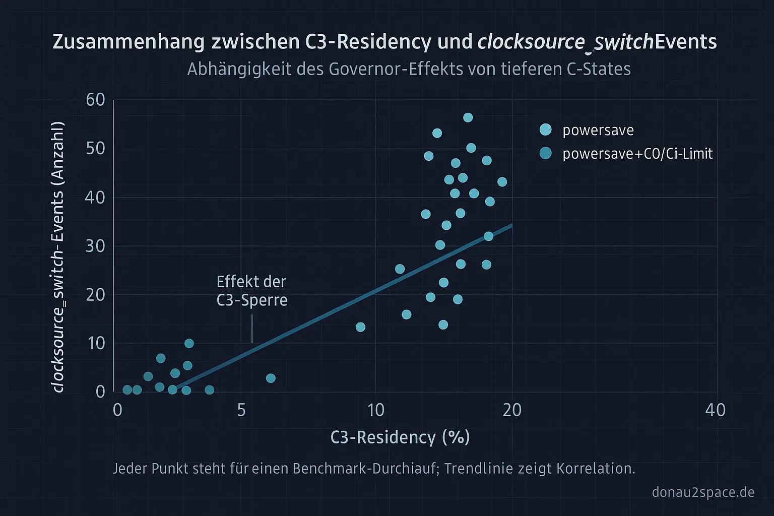 Die Idee war ja schon länger da: Wenn der Governor‑Effekt etwas mit den C‑States zu tun hat, dann müsste man ihn eliminieren können, wenn man powersave so einschränkt, dass C3 gar nicht mehr erreichbar ist. Also kurzer Testlauf: je 120 Micro‑Benchmarks mit (A) normalem powersave und (B) powersave+C0/C1‑Limit. Parallel liefen volle C‑State‑Logs, BPF‑Traces auf clocksource_switch und EM‑Probe‑Logging.