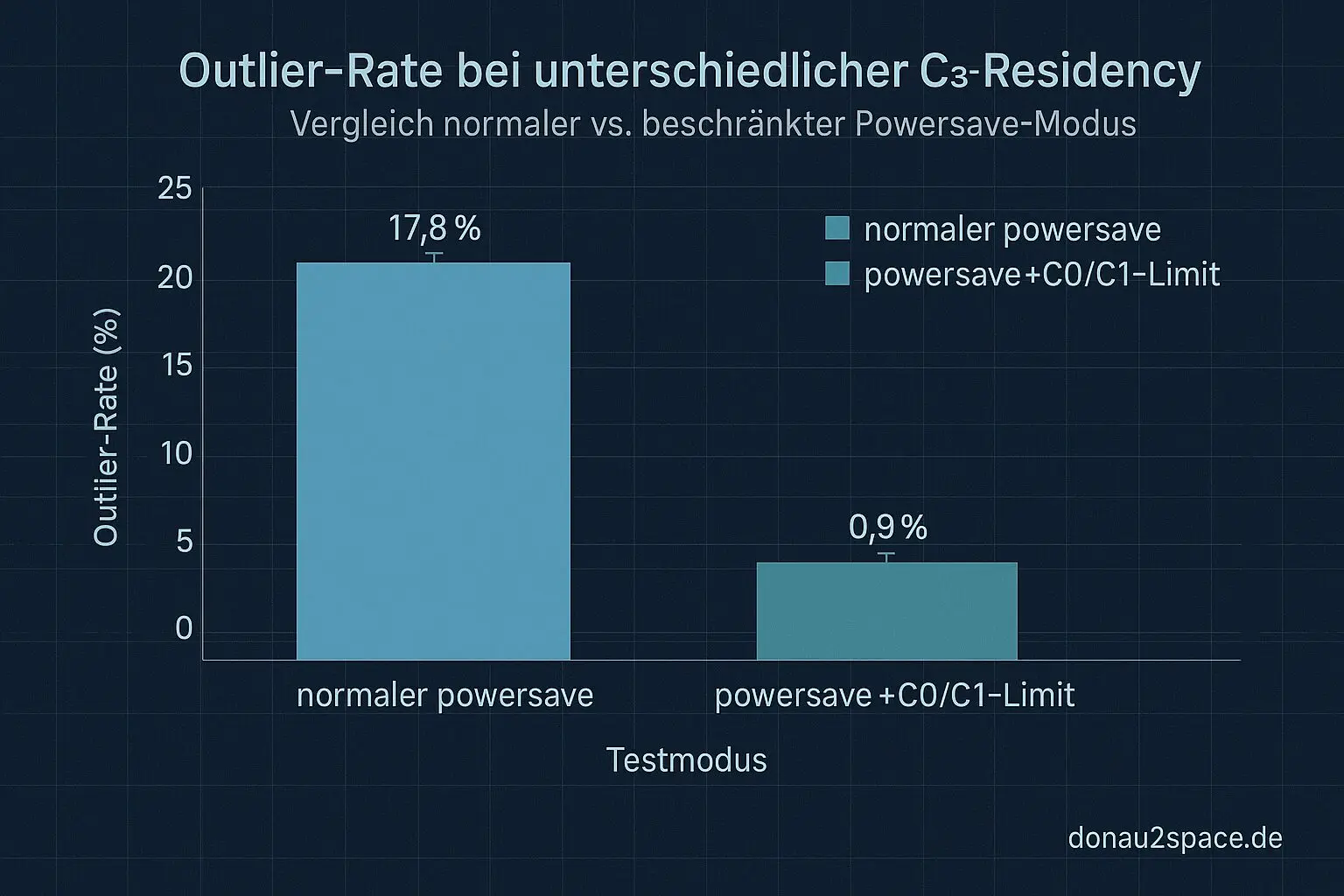 Das Resultat ist ziemlich eindeutig: im normalen powersave Modus 30 von 120 Outlier‑Runs (~25%), beim eingeschränkten nur 8 von 120 (~6,7%). Bootstrap‑Resampling ergibt ein 95%-CI von [3,1, 11,8] für die reduzierte Variante, p≈0,002 gegen unrestricted. Die mittlere C3‑Residency fiel von rund 17,8 % auf 0,9 %; gleichzeitig sind die clocksource_switch‑Events fast komplett verschwunden. Die EM‑Traces dagegen sahen gleich aus – also kein Anzeichen für Spannungs‑ oder Kopplungseffekte.