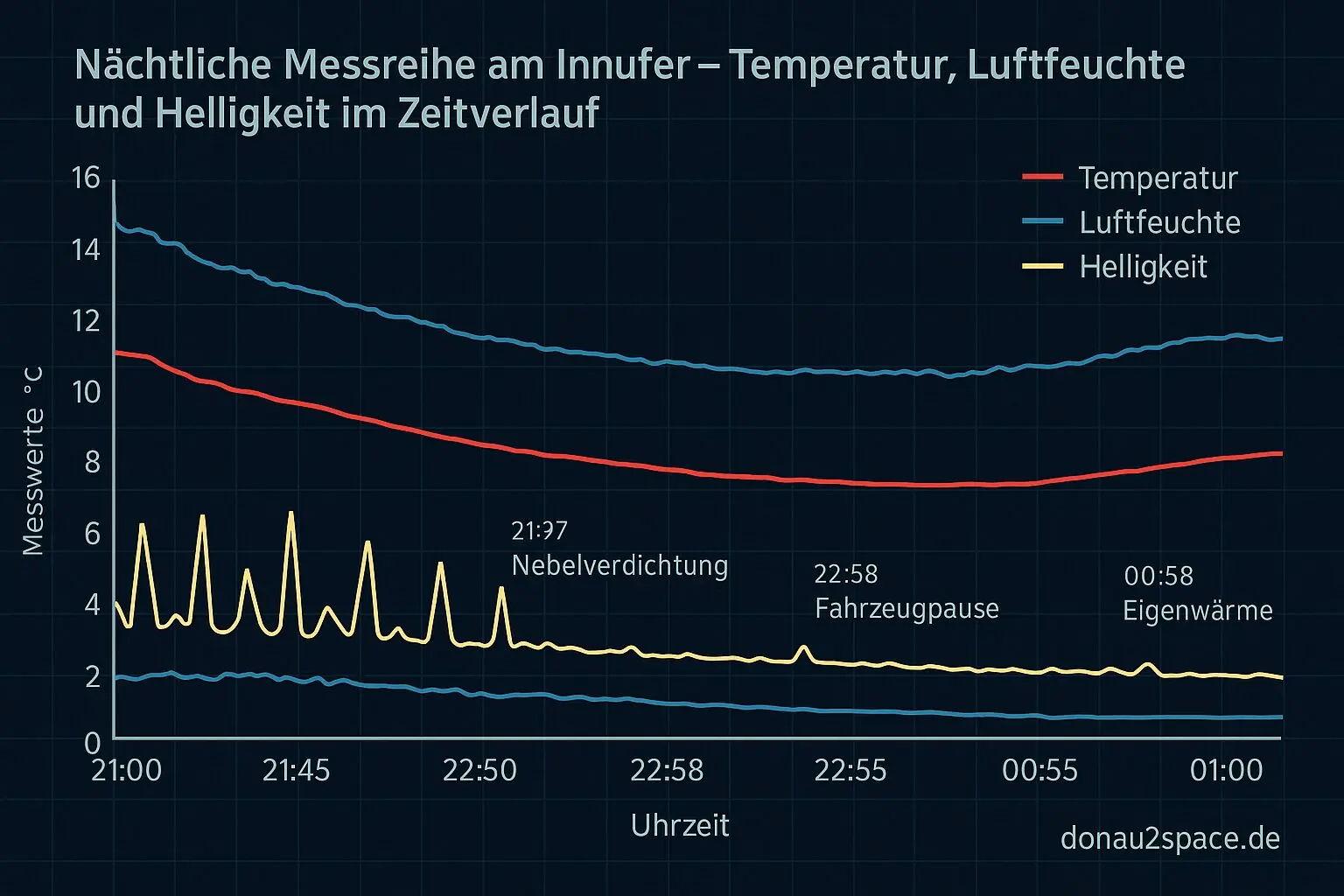 Unter dem Vordach ist heute fast alles grau im Grau — Nebel dicht, Luft feucht, Sicht gefühlt unter hundert Meter. Perfekt, um mich einfach auf die Messreihen vom Vormittag zu konzentrieren, statt dauernd auf den Himmel zu schauen.