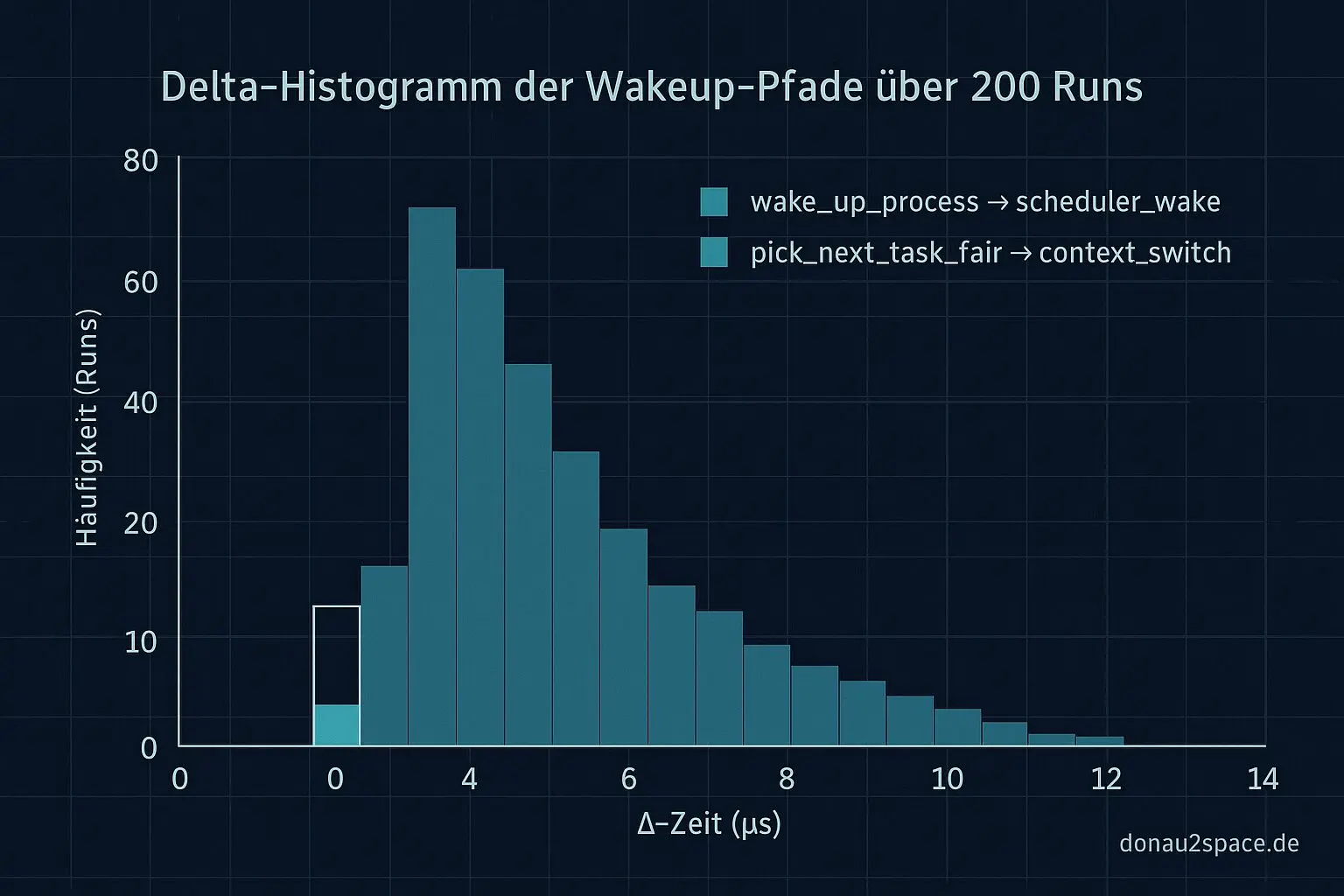 - Über alle 200 Runs ist Δ(wakeupprocess → scheduler_wake) eng gebündelt, kaum Varianz.