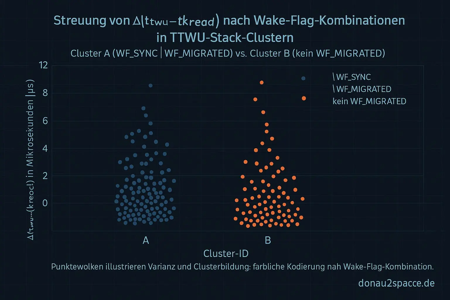 Das ist der Punkt, wo’s klickt. Die Cluster sind nicht nur „Variante desselben Pfads“. Sie hängen an einer konkreten Wake‑Flag‑/Migration‑Konstellation. Der Offset‑Trigger sitzt sehr wahrscheinlich an etwas, das durch TTWU synchronisiert wird, aber eben unabhängig davon ist, ob ich im Host oder in der VM laufe.