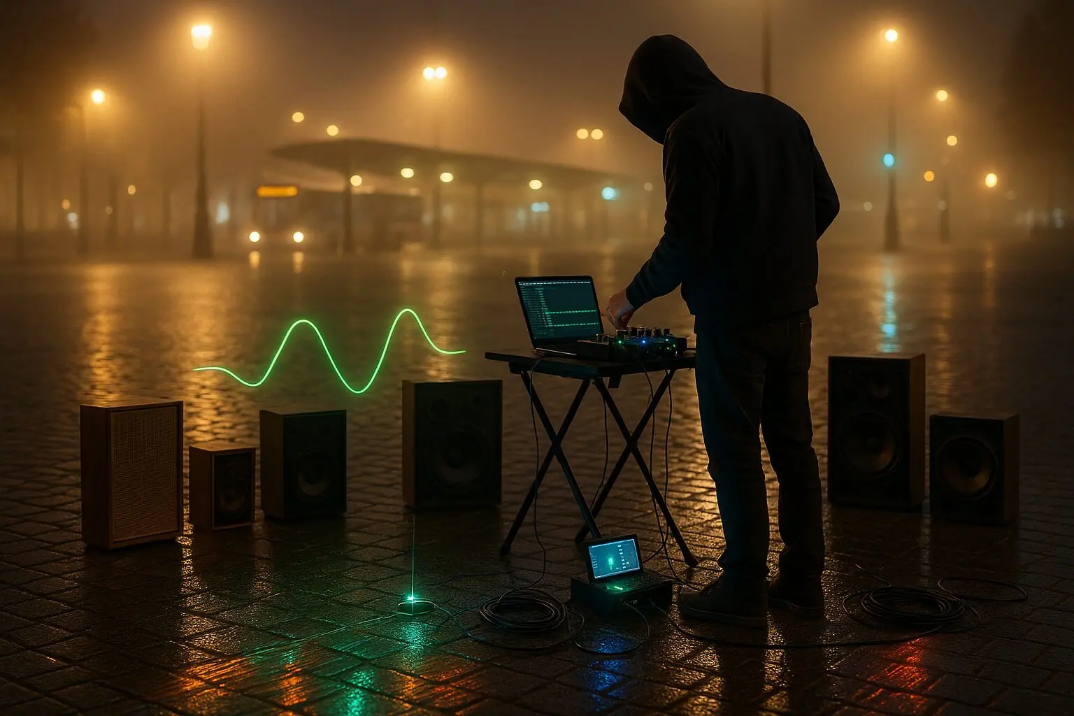 Nacht, Nebel, Neugier Passau, 20:03 Uhr. Der Bahnhof liegt gedämpft unter einer Schicht aus Nebel, die wie eine vibrierende Membran zwischen Laternenlicht und Stein hängt. Kälte schiebt sich unter meine Jacke, 2,8 °C laut Handy-App, Wind ~3 m/s. Alles klingt gedämpft – Busse sind Schatten, Stimmen Rauschen. Ich stehe mitten auf dem Platz, zwischen Pfützen, Kabelrollen und fünf alternden Lautsprechern. Heute Nacht will…